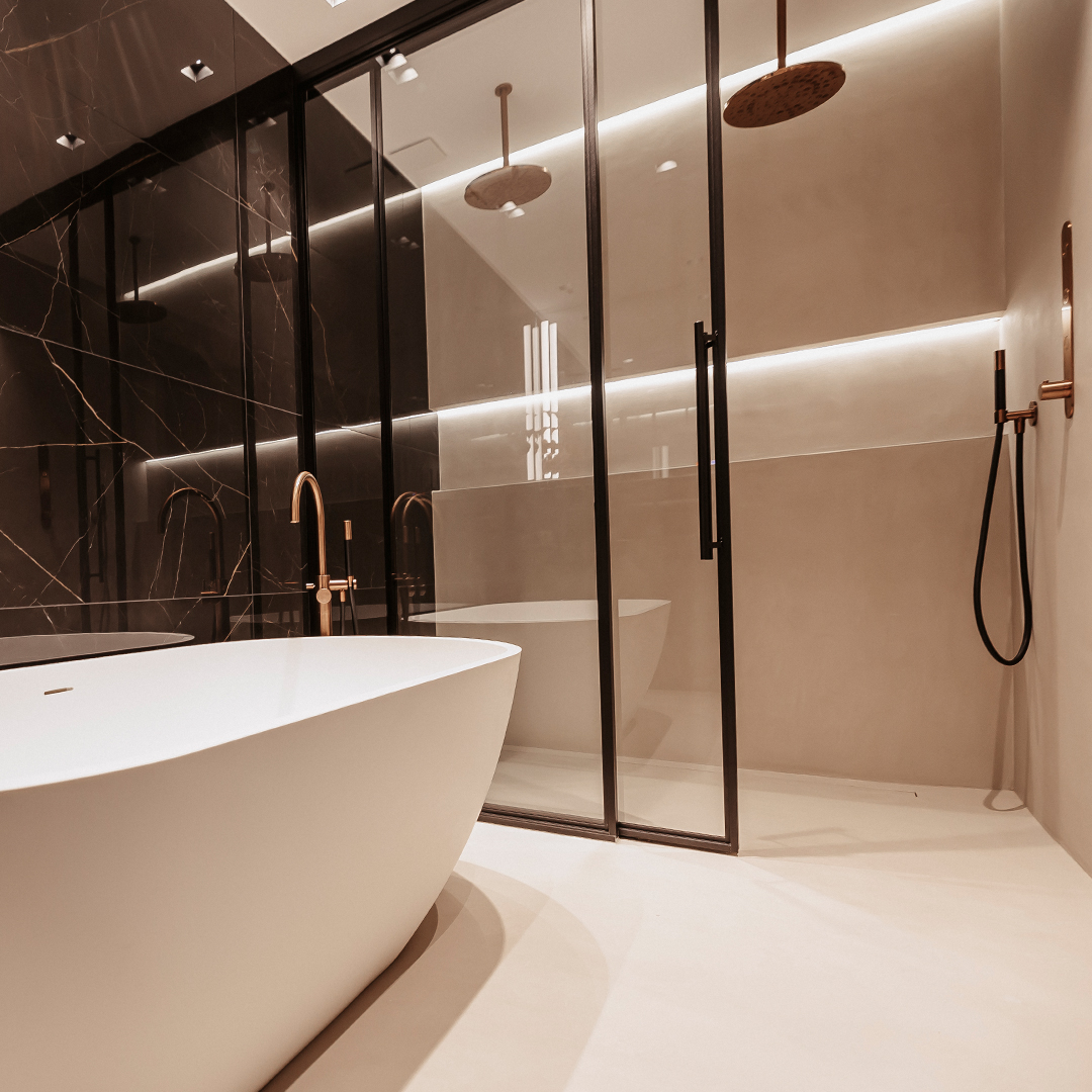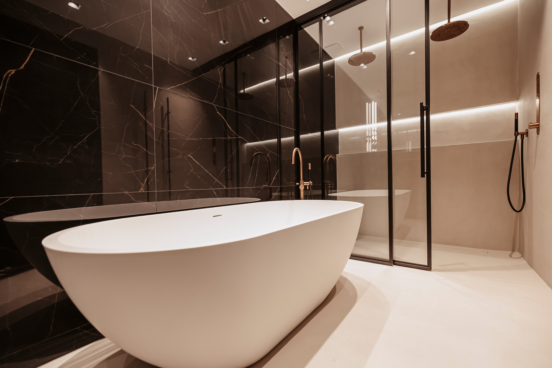 Dat Laura en John niet voor standaardoplossingen gingen, is wel duidelijk. Laura: ‘Ik wilde, zodra je de badkamer binnenstapt, een instant gevoel van luxe ervaren. Een beetje zoals je dat hebt in een 5-sterrenhotel. Veel zwart, goud, gecombineerd met natuurlijke materialen. Ik noem het hotel-chic.’ Voor ons installatiebedrijf werken we graag met de kranen van Hotbath en ik had al een tijd geleden mijn oog laten vallen op de geborstelde koper PVD kranen uit de Cobber-serie. ‘Die waren mijn inspiratiebron. Ik vind ze zo prachtig dat ik de hele badkamer rondom deze kranen heb ontworpen. Eigenlijk een beetje de wereld op z’n kop, maar ik zag het allemaal meteen voor me.’