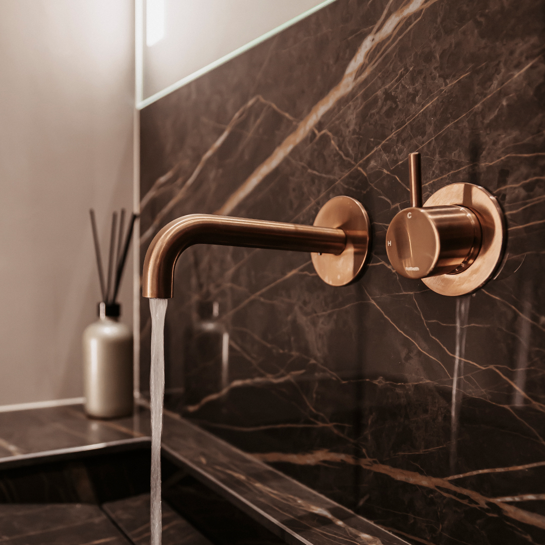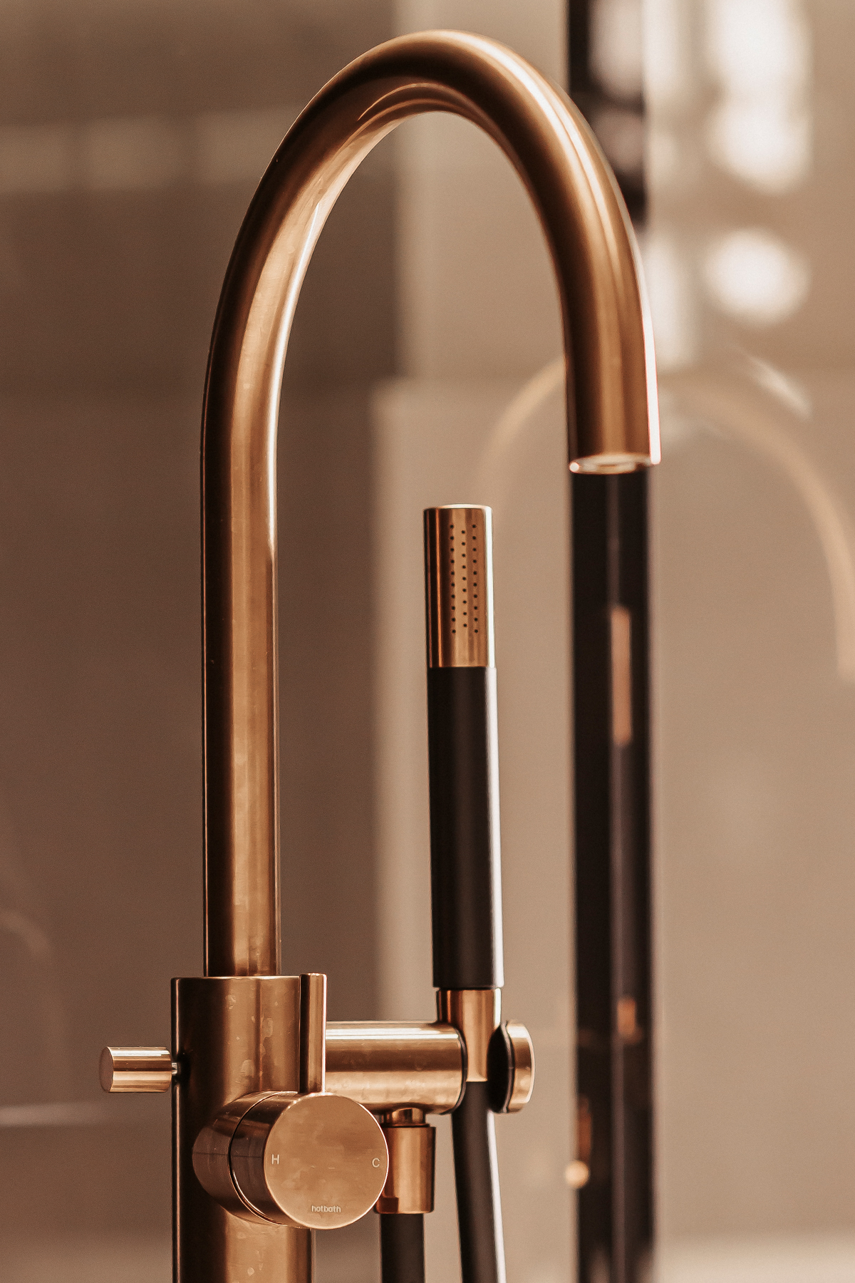 ‘De geborstelde koperen kranen in PVD van Hotbath waren het uitgangspunt voor de hele badkamer’ – Laura