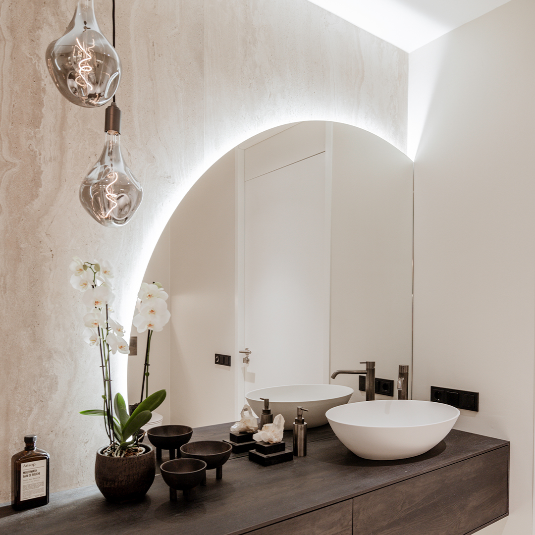 Voorheen hadden we twee wastafels, maar we gebruikten er maar één. Daarom hebben we nu gekozen voor één grote, ovalen waskom. Daarnaast staat de hoge wastafelmengkraan Cobber (CB003HC) met een extra lange uitloop te shinen. We zijn erg gevoelig voor lijnenspel in een interieur. Daarom hebben we de bedieningsknoppen van de regendouche verticaal op de extra grote travertin tegel geplaatst. Zo wordt de hoogte benadrukt en het is mooi in lijn met de rest van de badkamer. We starten de dag altijd onder de extra grote regendouche (Cobber M106), die met een wandarm is bevestigd. Het water klettert zo lekker op je hoofd en je lichaam. Het is ook een duurzame hoofddouche, doordat er lucht wordt toegevoegd aan het water (Eco-air systeem). Voor ons de perfecte start van de dag. De hand- en hoofddouche kunnen we tegelijk gebruiken. Handig als we samen onder de douche staan of als je even je nek wil masseren met de waterstraal.’