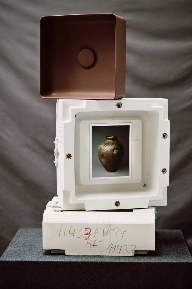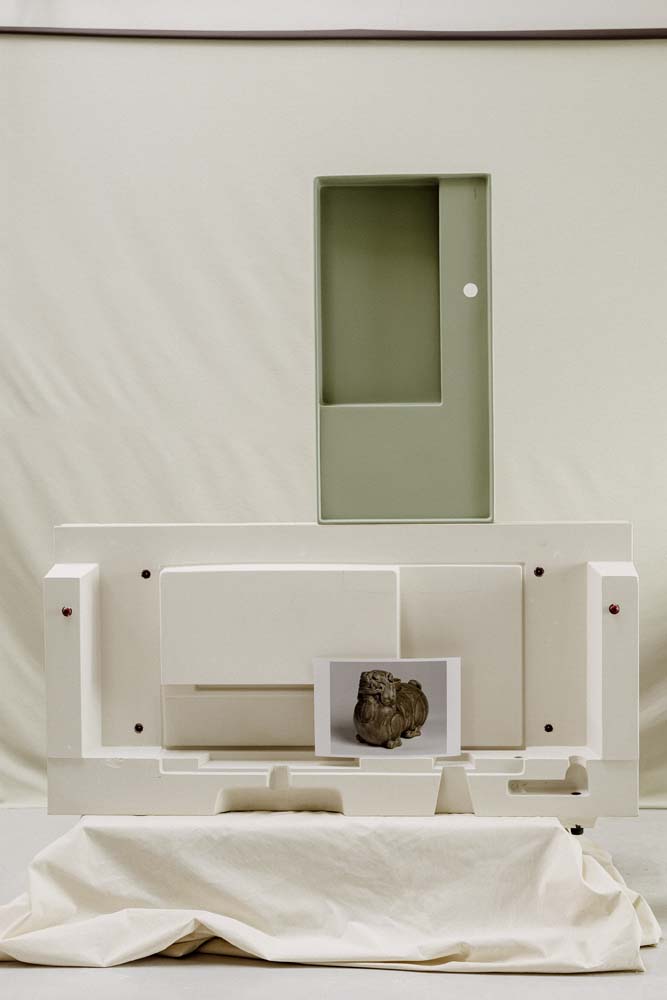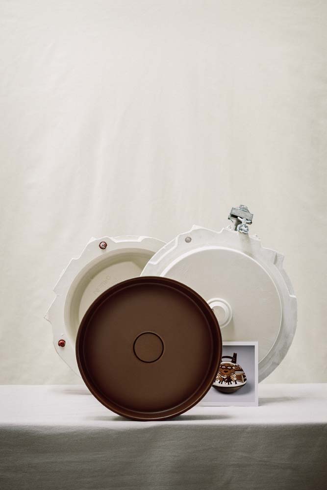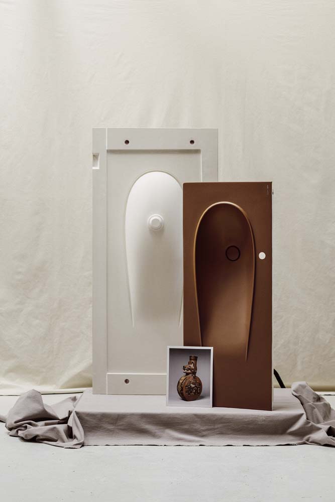 De installatie, samengesteld door Beda Achermann en Matteo Fiorini - Studio Lys, herwerkt archieffoto's van archeologisch keramiek met beelden die zijn gemaakt op de productielocatie van LAUFEN in Gmunden, Oostenrijk, op een abstracte en hedendaagse manier.