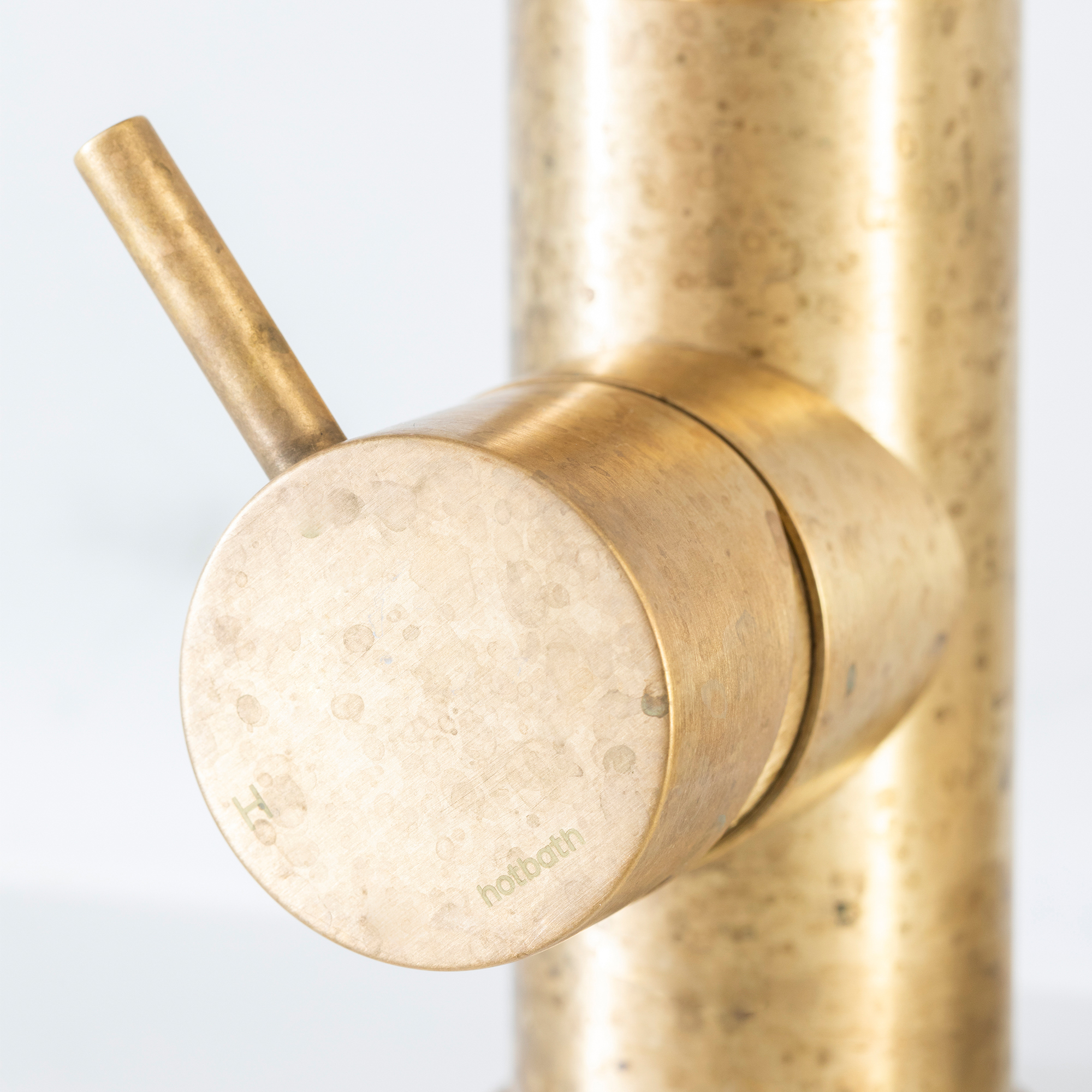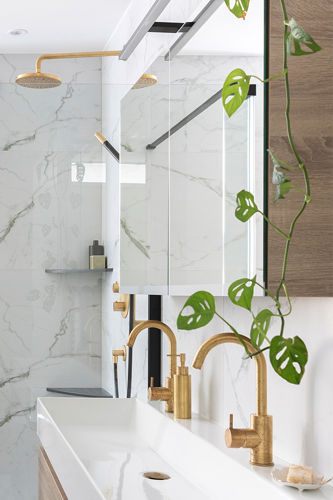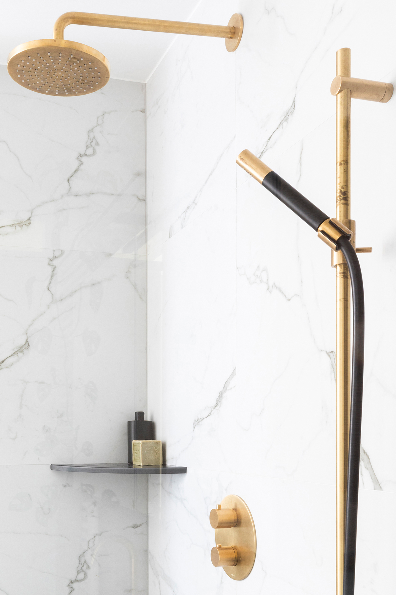 Ik ben gek op groen en marmeren tegels vind ik ook al mijn hele leven mooi. In eerste instantie hadden we zwarte kranen van Hotbath in ons hoofd. Kranenserie Cobber vonden we erg mooi. Toen ik zag wat er bij Hotbath allemaal mogelijk was qua kleuren en hoe mooi het werd gepresenteerd, was ik op slag verliefd op de kranen in geborsteld messing. Door het gebruik gaat het materiaal leven en verandert het oppervlak van kleur. De kranen van de wastafel (CB004) zijn al licht aan het verkleuren. Ik vind het best spannend hoe ze er over één of twee jaar uitzien, maar juist ook weer erg leuk. Het zijn echt unieke kranen.’
