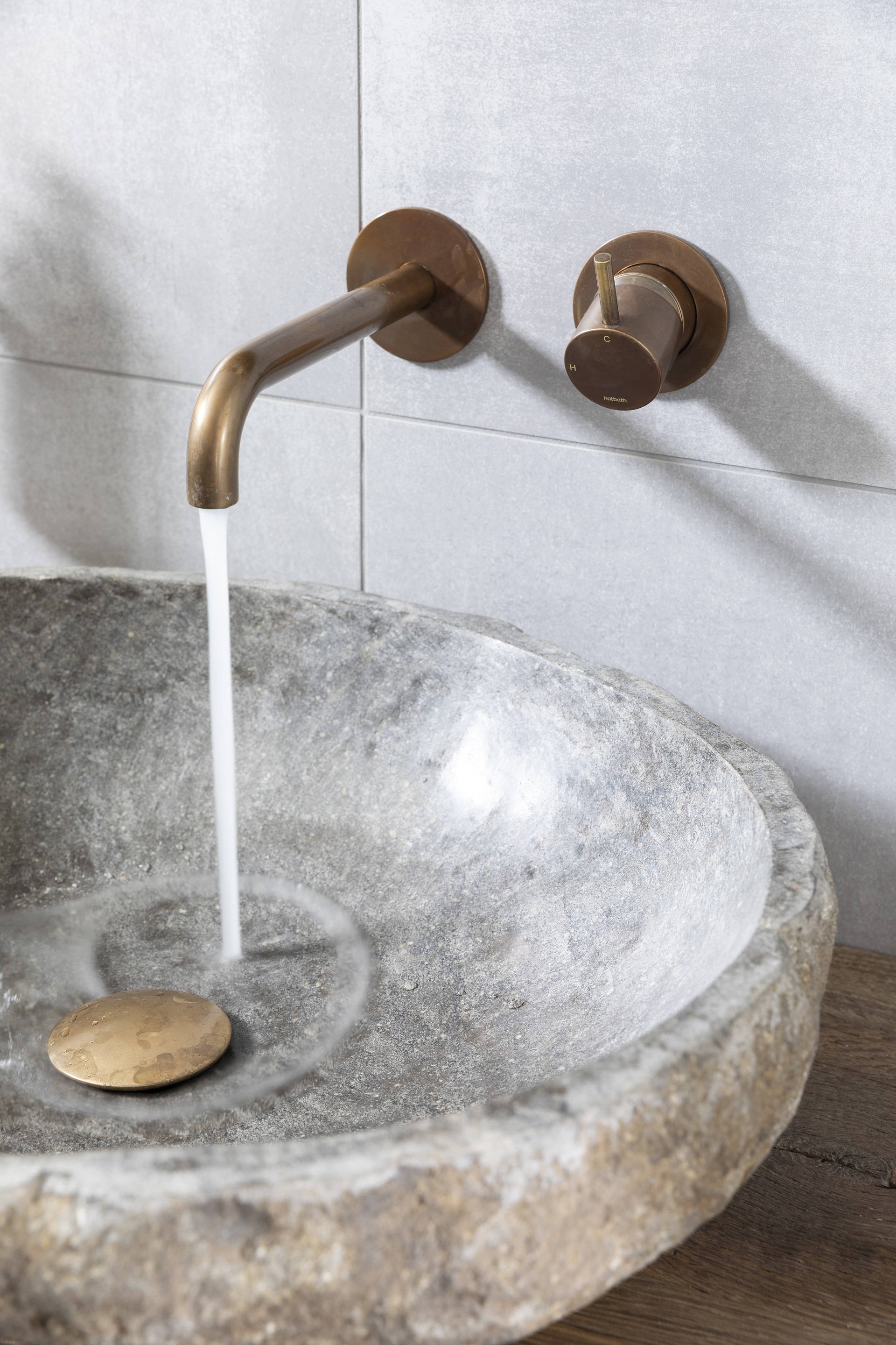Toen ik de kranen van verouderd messing van Hotbath zag, was ik verkocht. Ik heb niet verder gezocht, het was patsboem raak.’ De kraan van verouderd messing is één van de vijf ‘living colours’ uit de Cobber serie, die door het gebruik een uniek patina krijgt. ‘Ik houd van natuurlijke materialen, met een doorleefde uitstraling. Verouderd messing zorgt voor warmte en gaat leven door invloeden van buitenaf en doordat je het materiaal aanraakt. De wastafelmengkraan (Cobber CB005AB), de badmengkraan (Cobber B021AB) en de stortdoucheset (Cobber SDS9AB) zijn allemaal uitgevoerd in deze finish en hebben inmiddels een unieke uitstraling. De badkameraccessoires van Hotbath zijn ook verkrijgbaar in verouderd messing en kon ik niet weerstaan.