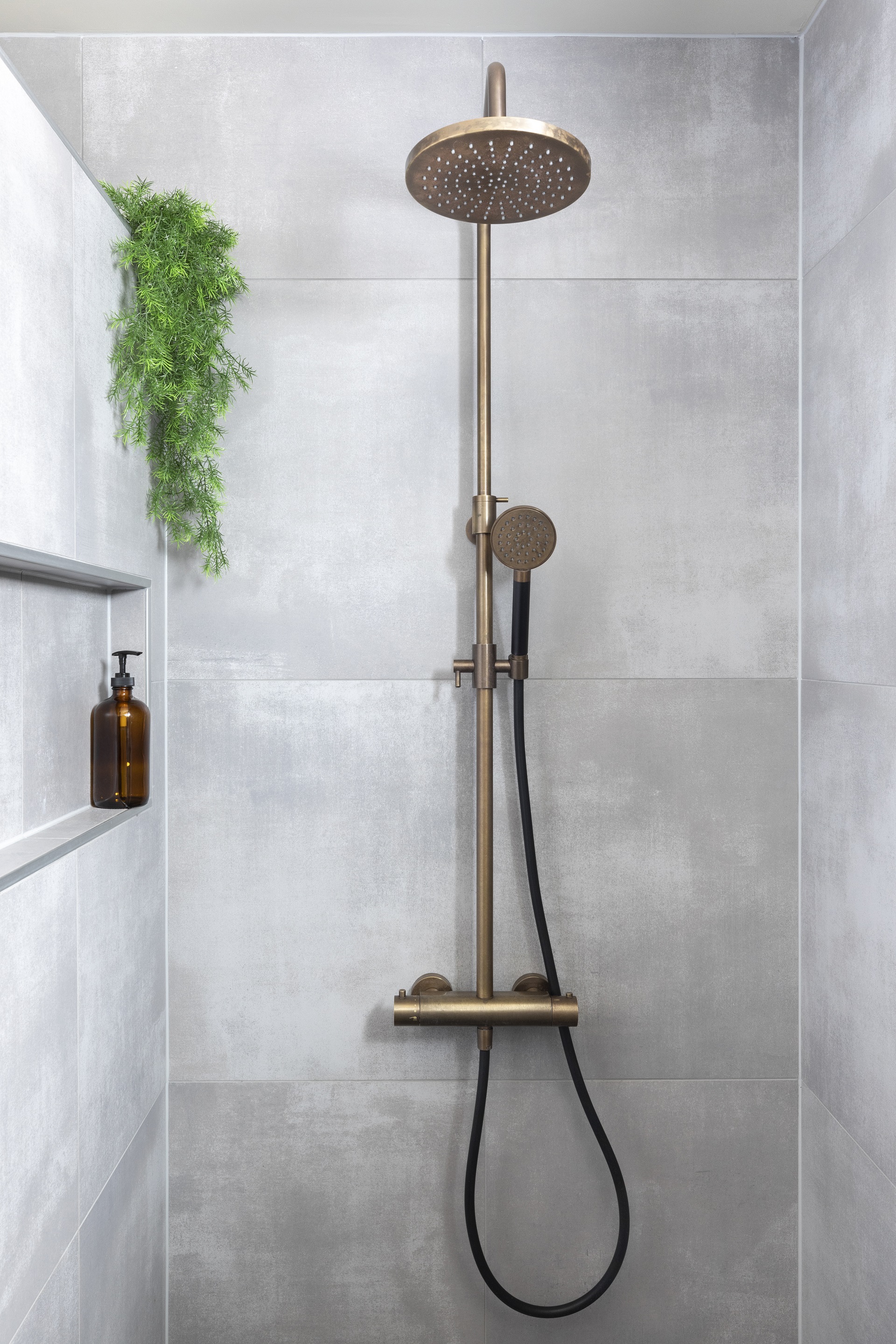 Verouderd messing is en blijft een bijzonder materiaal, heel iets anders dan chroom of RVS. Elke keer als ik de badkamer binnen kom, denk ik: ‘wat een juweeltje’. Onze familie en vrienden zeggen zelfs dat het de mooiste ruimte is van ons huis.’ – Janet