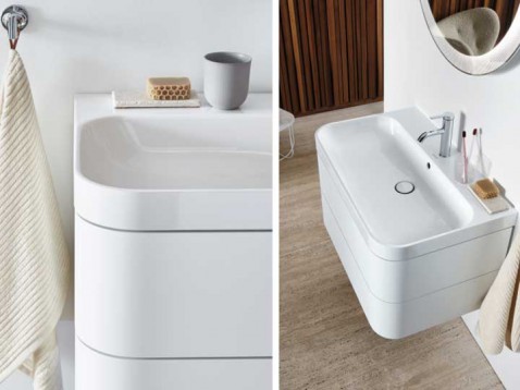 Het massieve oppervlaktemateriaal DuraSolid heeft door zijn materiaalstructuur de weg geëffend voor matte baden en douchebakken. Bij keramiek zijn nu nieuwe ontwerpopties in te zetten door toepassing van glazuur in mat-wit of mat-antraciet. Tweekleurig-contrasterende waskommen — wit-glanzend aan de binnenzijde, mat-antraciet van buiten — geven de serie Happy D.2 Plus onafhankelijkheid. In de Serie Luv onderstrepen de zijdemat geglazuurde buitenoppervlakken in wit, grijs of zandkleur de tijdloze, emotionele elegantie.