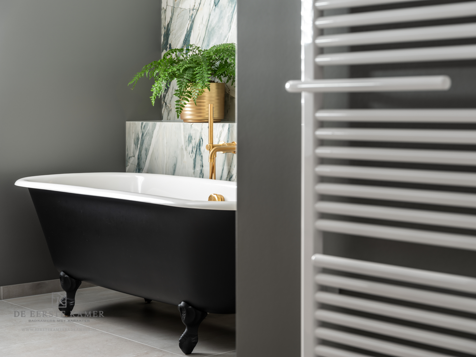 Het kwalitatief hoogstaande vrijstaand bad welke is hergebruikt geeft een uniek karakter aan deze zorgvuldig uitgekozen combinatie van tegels, accessoires en sanitair.