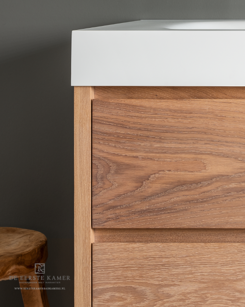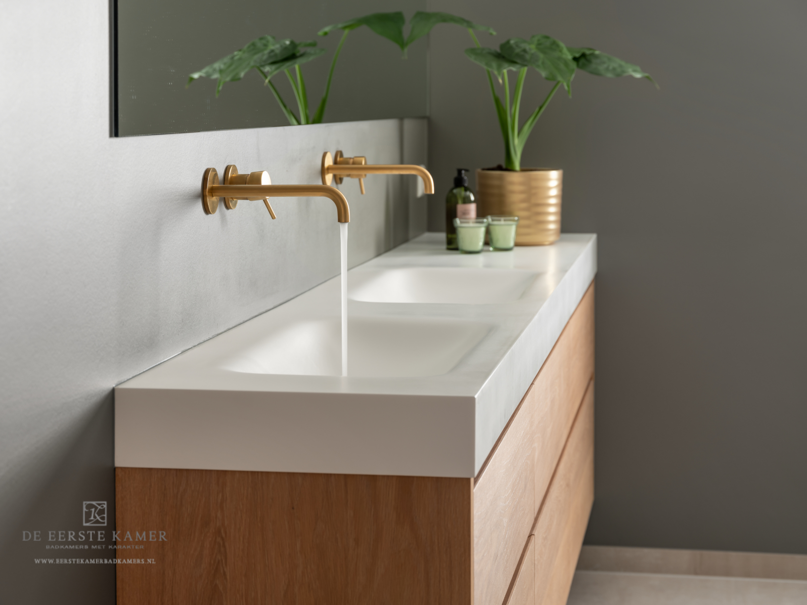 Het exclusieve op maatgemaakte badkamermeubel van 260cm is uit onze eigen DEK-design collectie. Daarboven over de gehele wand een rechthoekige spiegel geeft de badkamer een luxueuze uitstraling en nog meer diepte.