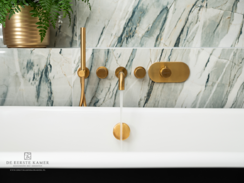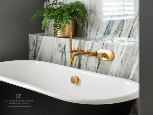 De gedurfde combinatie van de groen getinte marmeren wandtegels in combinatie met goudkleurige kranen geeft deze badkamer een hotel chique uitstraling.