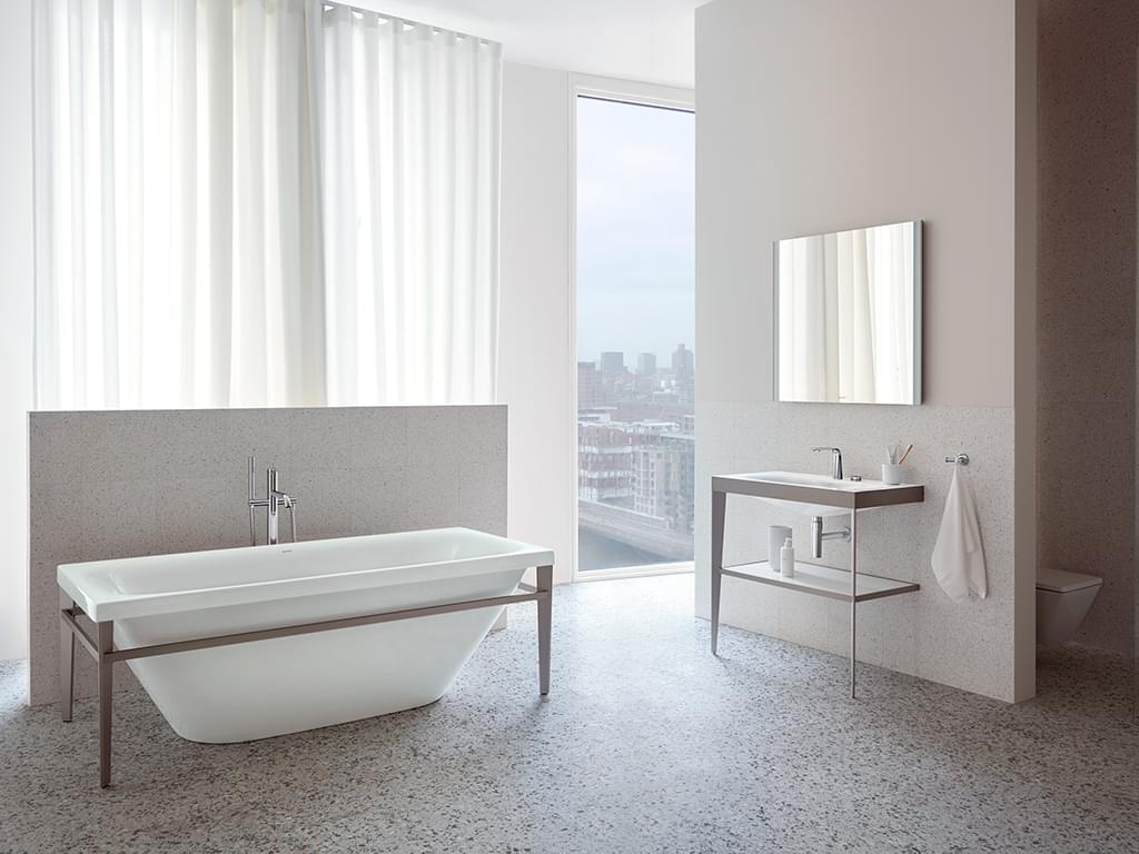 Het nieuwe programma omvat de wasplaats en het bad- en wc-gedeelte van de badkamer. Terugkerende designelementen en speciale details kenmerken het alomvattende interieurontwerp. Het hoogtepunt wordt gevormd door een wastafel die is gebaseerd op de door Duravit gepatenteerde c-bonded-technologie. Aan de buitenzijde, extreem precies, als rechthoek vormgegeven, van binnen organisch zacht gebogen, met een ruime inbouwwaskom en royale legruimte. De rand langs het kraanvlak loopt als een subtiele lijn naar buiten verder. Het fijne detail van de horizontale overloop in de wastafel onderstreept de horizontale vorm van de buitenzijde. Aan de binnenzijde volgt het keramische materiaal de zachtheid van het water. Verrassende details: de wit-keramische afdekking van de push-open-klep is in geopende stand evenwijdig aan de binnenzijde. Het significante profiel van de V-vormige metalen draagconstructie, in elegant matchampagne of avant-gardistisch matzwart, creëert dynamische spanning. Een glazen inlegger in vier kleuren maakt individuele combinaties mogelijk.