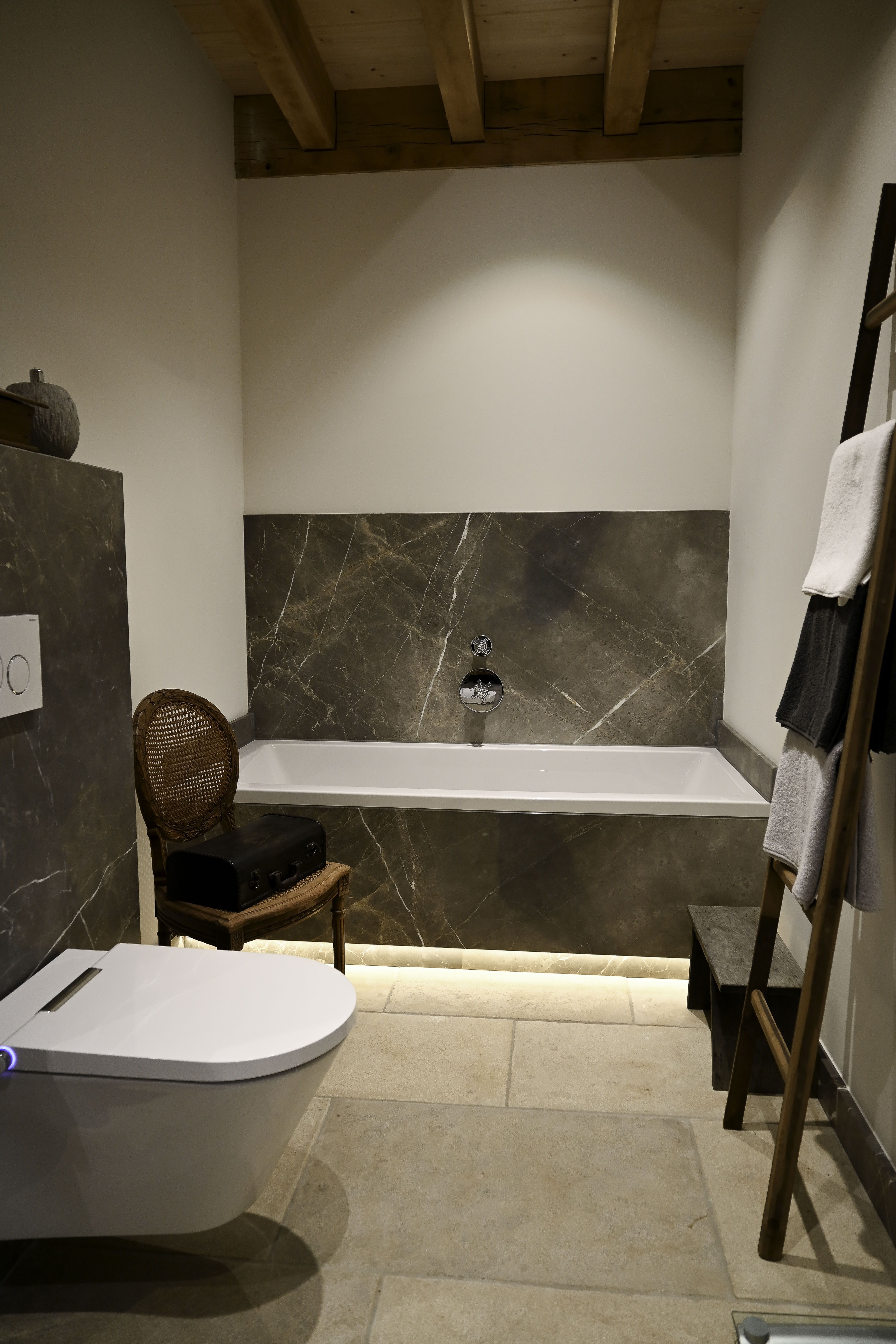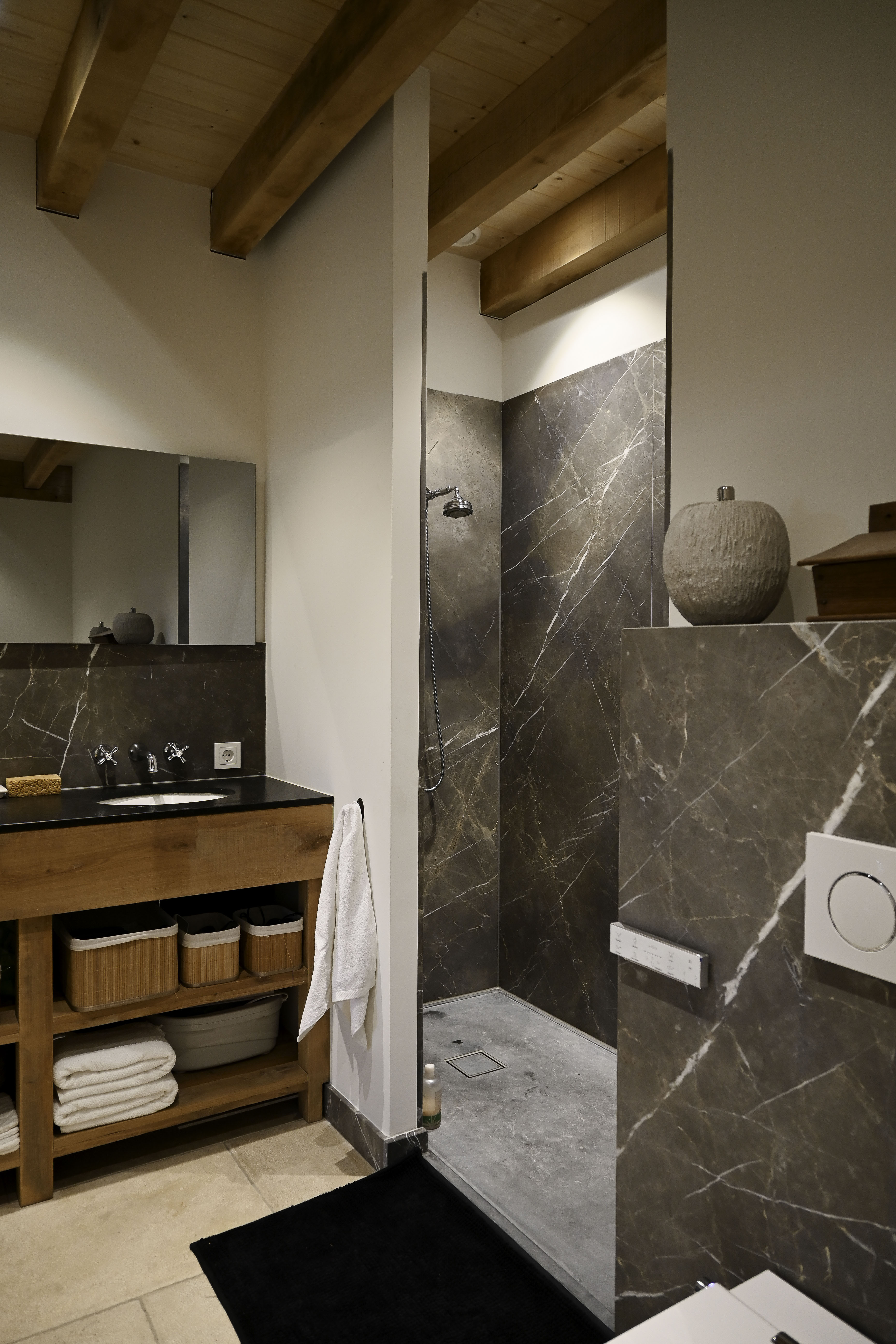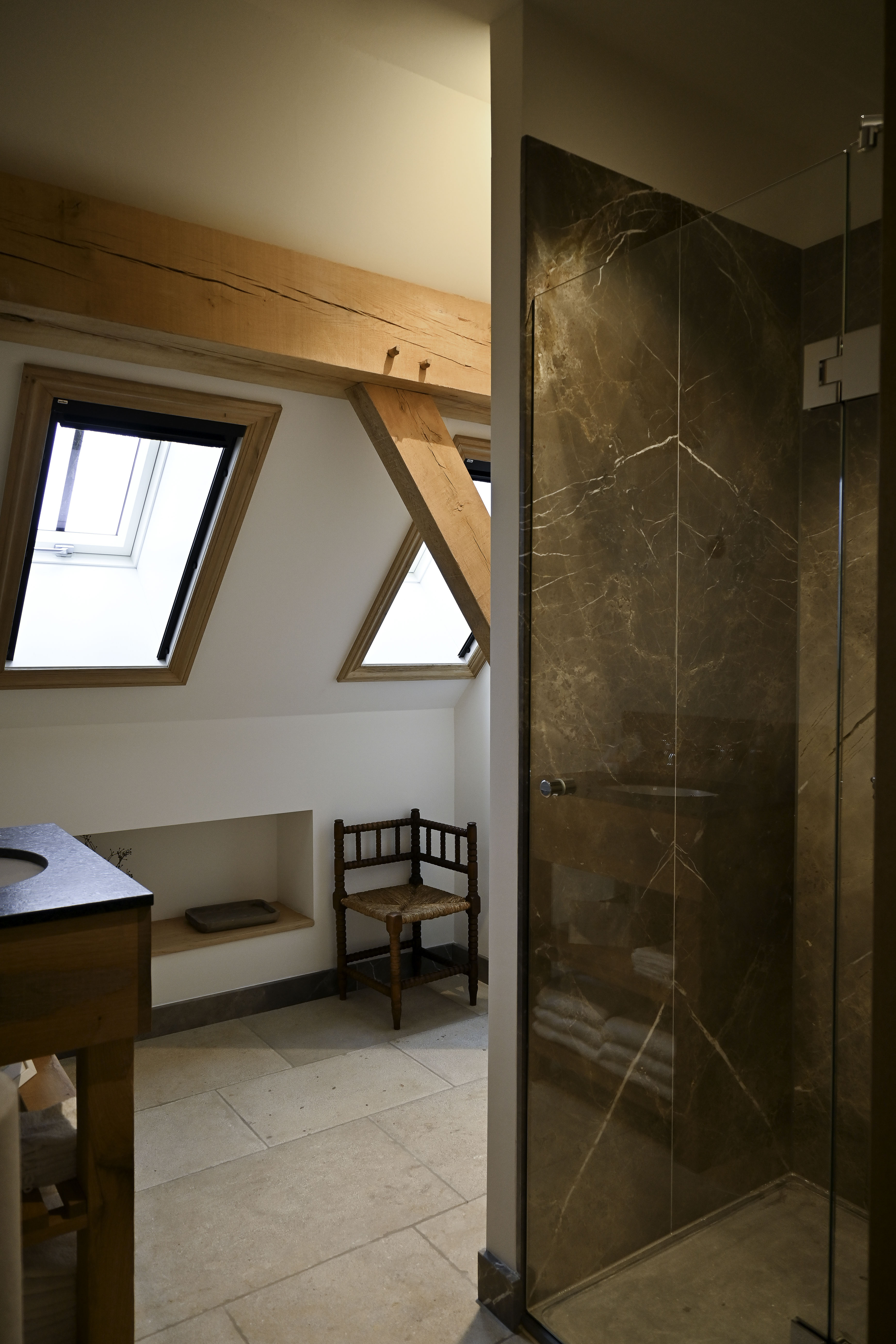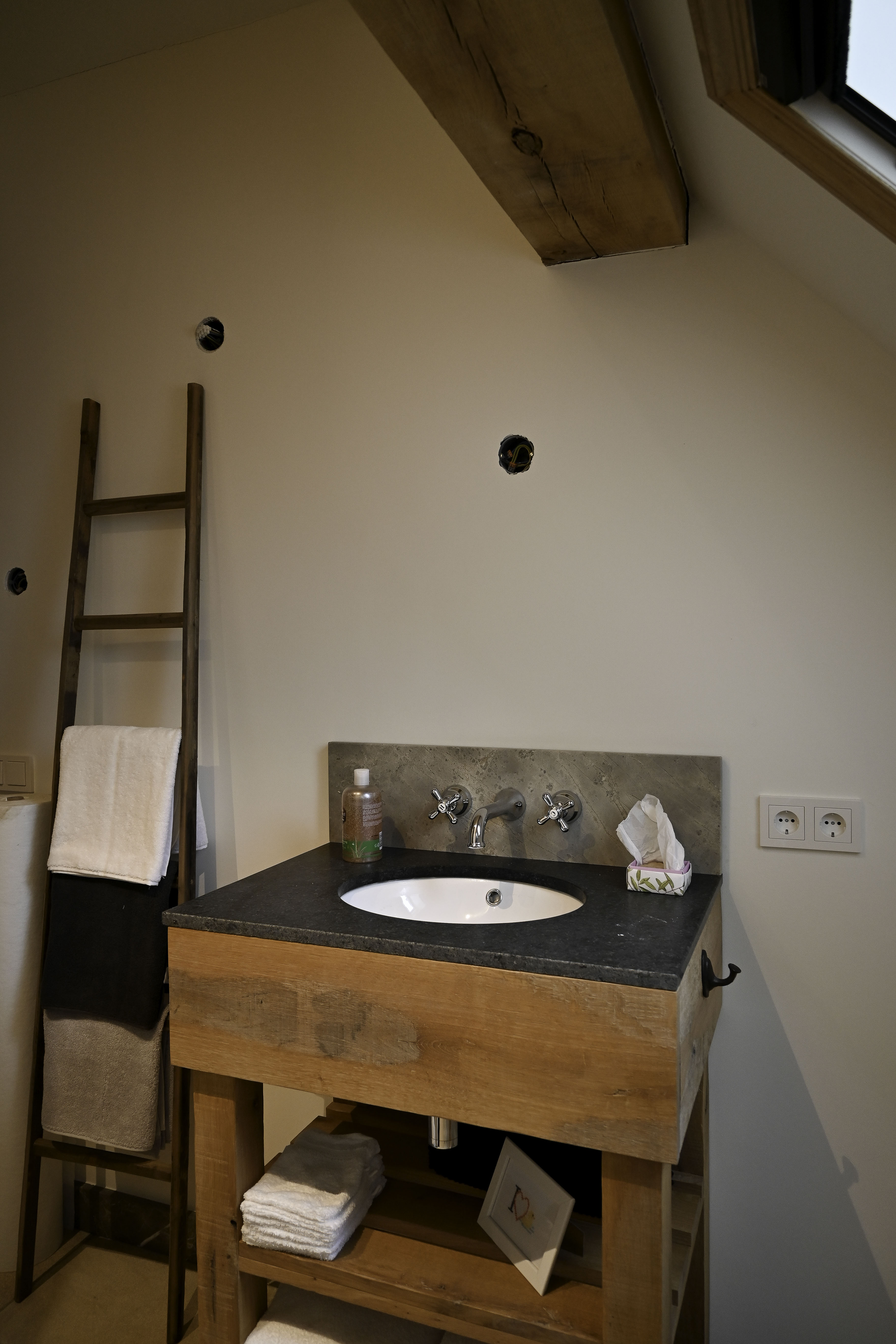 LANDELIJKE BADKAMER EN SAUNA| Door te werken met natuurlijke kleuren en materialen is deze badkamer een rustige en warme ruimte waar je je dag fris en ontspannen kunt beginnen. De klanten hebben twee badkamers. Op de eerste 5 foto's vind je de eerste badkamer. Deze heeft een groot en eikenhout wasmeubel met klassieke kranen. Daarnaast vind je de inloopdouche. Het toilet is een totale luxe met de opties waar deze over beschikt! 1 van deze opties is een heerlijk warme toilet bril. Bij de tweede badkamer is er gebruik gemaakt van dezelfde stijl en materiaal.