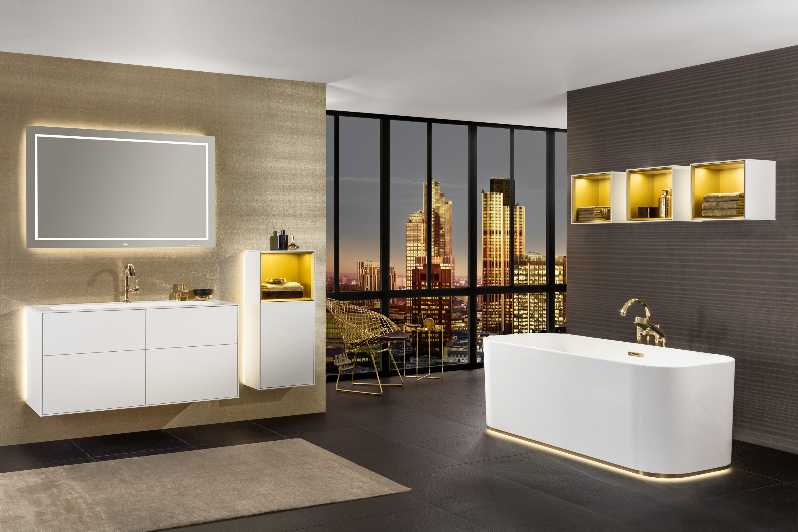 Het Finion bad is verkrijgbaar met en zonder een designring onderaan de buitenkant van het bad. De ring is er in de hoogwaardige metallic-tinten chroom, champagne en goud en zorgt voor een extra elegante uitstraling. De ‘push-to- open-plug’ en de badkraan kunnen in dezelfde tinten als de designring worden uitgevoerd. Het bad kan ook uitgevoerd worden met indirecte verlichting aan de onderkant van het bad.