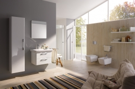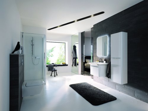 Ook voor de inbouwwastafel is een onderkast beschikbaar. Het afdekblad voor de rechts- of linkszijdig te integreren wastafel is voorzien van een luxe glasafwerking en een voorgeboord kraangat. Het meubelprogramma wordt afgerond door een 150 cm hoge, 40 cm brede en 25 cm diepe hoge kast. Deze biedt met één vaste en vier verstelbare glazen leggers bergruimte naar individuele wens. Een origineel en praktisch detail is de in de deur geïntegreerde opbergtas met opbergvakken voor benodigdheden als lippenstift, nagelschaar, vijlen, pincet, borstels, lotion of douchegel. De meubels zijn leverbaar in hoogglans gelakt wit of taupe, een eigentijdse grijs/bruine warme tint.