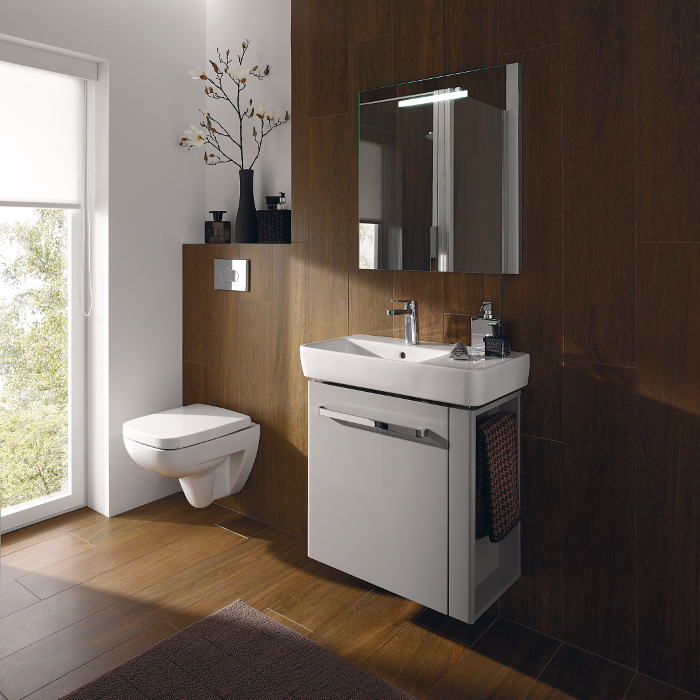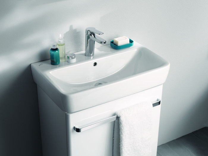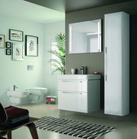 De 50 cm brede fonteinen, beschikbaar in een symmetrisch model en twee asymmetrische varianten, zijn bij uitstek geschikt voor de inrichting van een comfortabele kleine badkamer. Deze kunnen worden gecombineerd met een onderbouwkast. Bijzonder is dat de zijkant links of rechts inspringt, wat ruimte biedt aan de geïntegreerde handdoekhouder. Daarmee is een aparte handdoekhouder naast de wastafel overbodig. De aldus verkregen ruimte kan ook benut wordt als extra aflegruimte voor het plaatsen van allerhande benodigdheden. De geïntegreerde handdoekhouder en de greep van de kastdeur zijn op gelijke hoogte geplaatst, voor een harmonieus totaalbeeld. Ook de 65 cm brede wastafel is voorzien van deze handige extra's. Alle wastafelonderbouwkasten zijn uitgerust met een enkele deur en kunnen naar wens voorzien worden van meubelpoten. Alle meubels zijn leverbaar met een korpus in mat wit of mat lichtgrijs en fronten in hoogglans. Drie spiegels met verlichting ronden het meubelprogramma af.