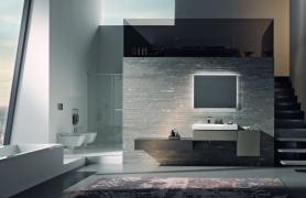 Een omvangrijk meubelprogramma met wastafelonderbouwkasten in verschillende uitvoeringen en een exclusieve hoge kast, biedt de benodigde opbergruimte. De meubels zijn in vorm en functie afgestemd op het keramiekprogramma. De gelakte meubels in hoogglans wit of kwartsgrijs, voorzien van verchroomde grepen, dragen bovendien bij aan sfeer en uitstraling van de badkamer. Als extra blikvanger biedt het assortiment een bijpassende spiegel met ledverlichting en een geïntegreerde lichtschakelaar. Deze spiegel is beschikbaar in een hoge variant (40x80 cm) en in verschillende vierkante formaten (60, 70, 90 en 120 cm, hoogte 65 cm).