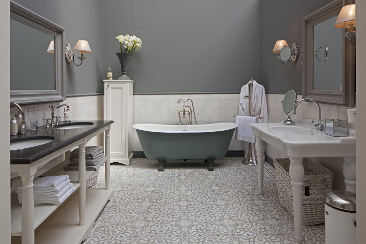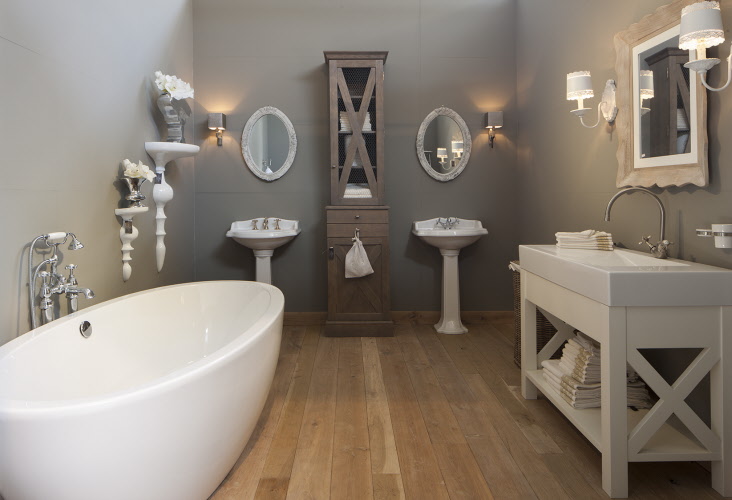 Gerealiseerd badkamer project. Luxe hotelkamers met dubbele douche, koperen bad en klassieke badkraan