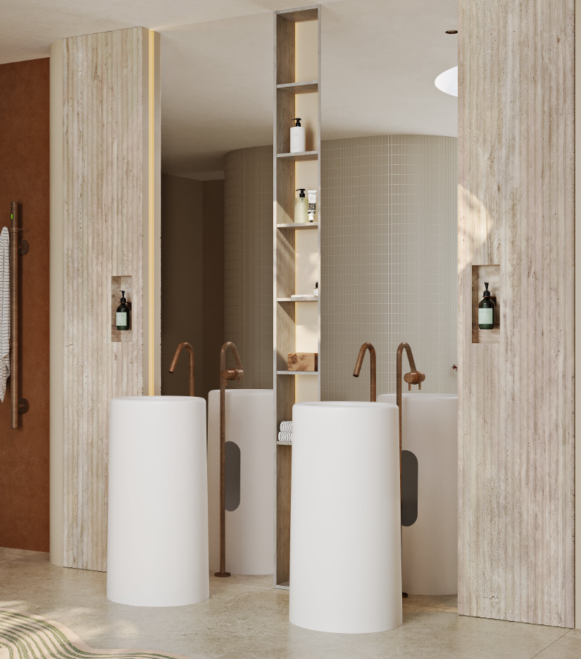 Deze stijl is een ode aan kracht en elegantie, waarbij geen compromissen worden gemaakt. Door de combinatie van robuuste vormen en luxueuze texturen ontstaat een badkamer die zowel gedurfd als harmonieus aanvoelt. Statement pieces, zoals centraal geplaatste waszuilen en een sculpturaal bad, vormen de blikvangers. Ondanks hun krachtige design stralen ze zachtheid en comfort uit dankzij de verfijnde materialen.