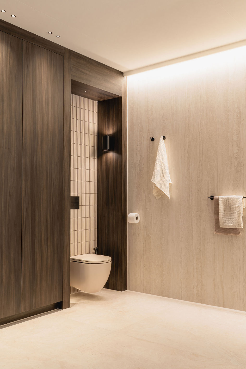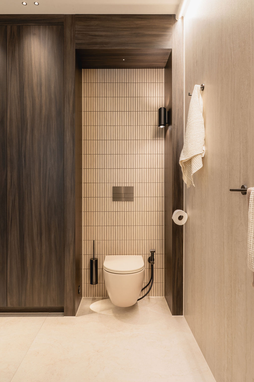 Deze prachtige badkamer, omhult in warme en sfeervolle materialen, vormt een voetstuk van design. De strakke uitstraling, horend bij een design badkamer, vinden we terug in de tegels en het lijnenspel. Kijk bijvoorbeeld naar de kitkat tegels, de grote vierkante vloertegels, douchewand en de kastenwand. Laatstgenoemde toont een van de vele unieke designkeuzes in de badkamer: het toilet is namelijk verwerkt in de royale maatwerk kast.