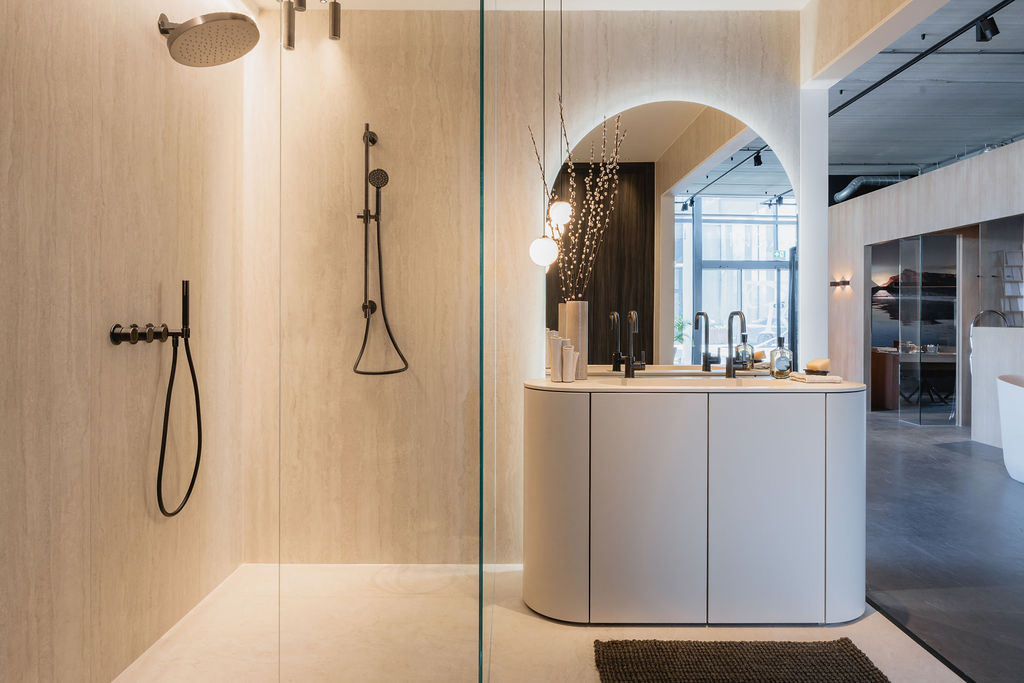 Ontdek hoe deze badkamer, te verwonderen in onze showroom, design en sfeer samenbrengt.