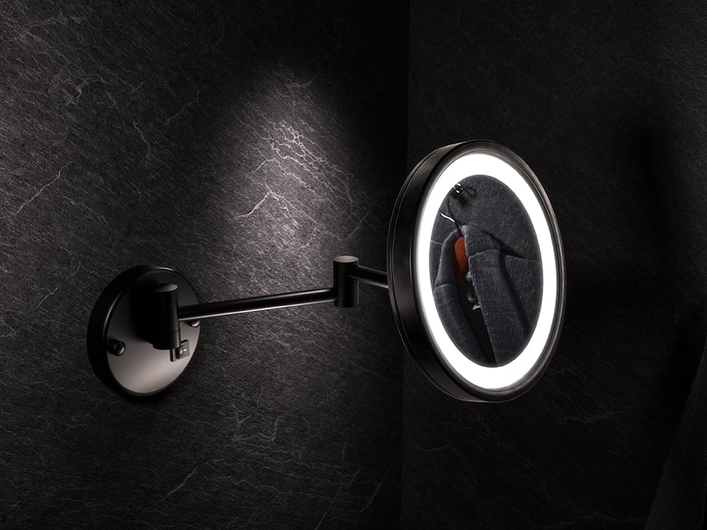 De royale tweearmige cosmeticaspiegel maakt de dagelijkse gezichtsverzorging een aangename activiteit. De diameter van 215 mm biedt een perfect zicht, doordat deze 3x vergrotend is. De spiegel is rondom afgewerkt met ledverlichting, welke het daglicht imiteert en voor een gelijkmatige belichting van het gezicht zorgt. Hierdoor is elk detail goed op te merken, zowel bij het aanbrengen van make-up als het scheren van de baard. De robuuste muursteun en de verfijnde matzwarte finish maken de trendy look af.