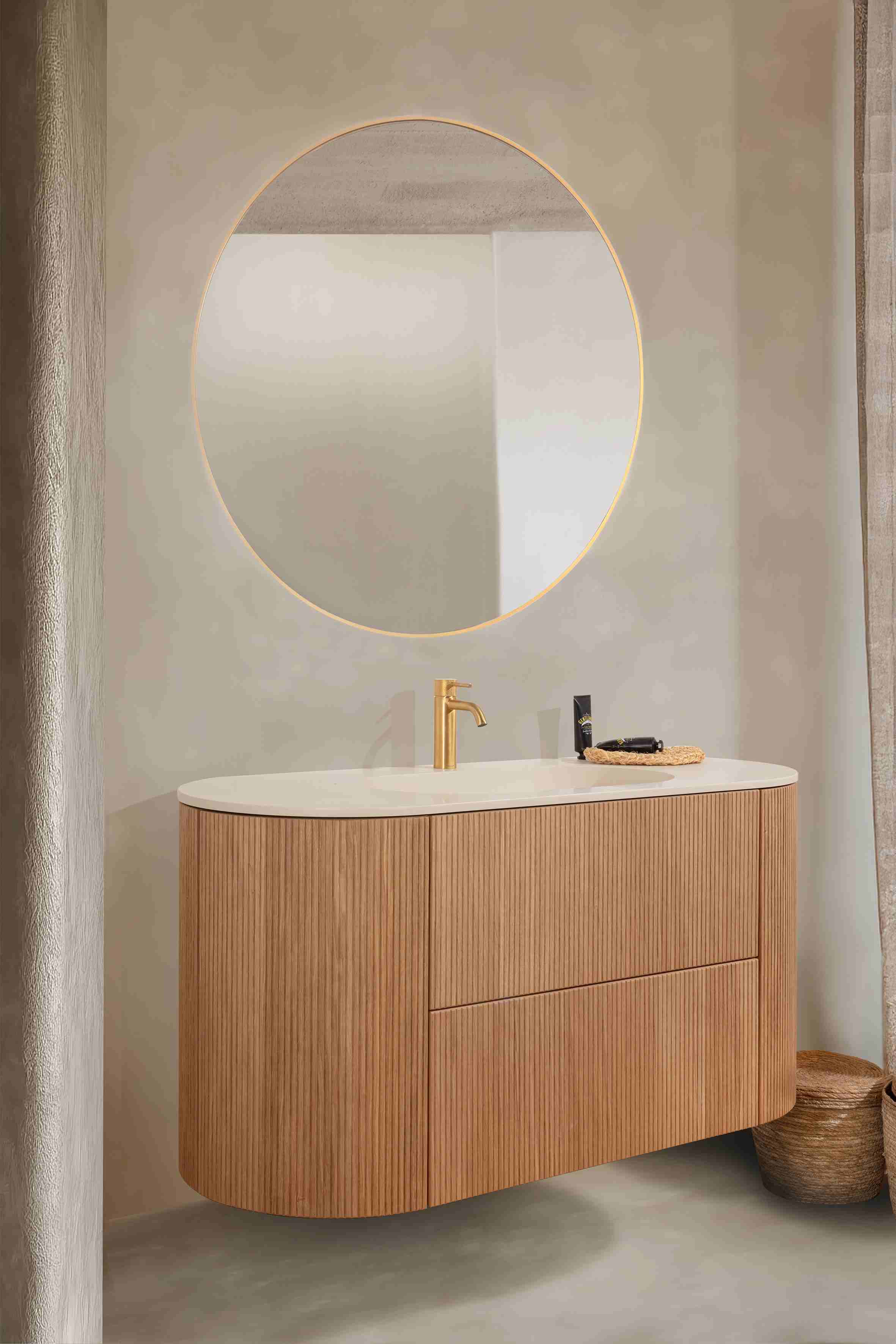 De No Limit Oval is reeds enkele jaren in het assortiment en pronkt reeds in heel wat showrooms en badkamers. Nieuw hier is de uitvoering in fineer hout met massief houten latjes. Hier presenteren we ook twee nieuwe wastafels! Naast de top solid wastafels en de betonnen wastafel met 1 grote waskom, lanceren we hier ook de betonnen en top terrazzo wastafel met aflegruimte rond de waskom.