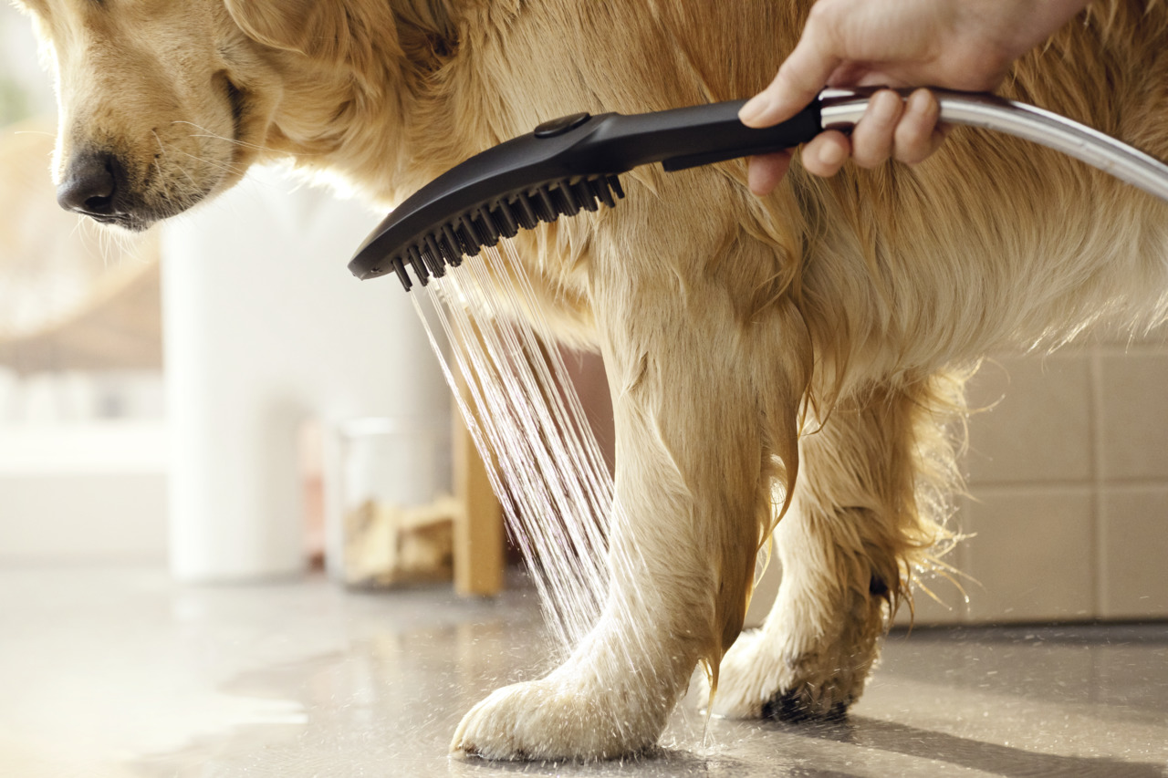 De hansgrohe DogShower, ook bekend als Furly DogShower, werd in samenwerking met hondenexperts en -psychologen ontwikkeld. Het massage-effect van de sproeiers doet denken aan het aaien van de rug terwijl de hond geniet van een ontspannende douche-ervaring. De zachte, stille straalsoorten en massagesproeiers verminderen de stress bij het afspoelen. Daarnaast kun je heel eenvoudig tussen de drie straalsoorten wisselen. Met de Select-knop met één hand voor harmonisch vloeiende douchesessies. Dat is heel makkelijk net zoals bij de hansgrohe douches voor de baasjes.