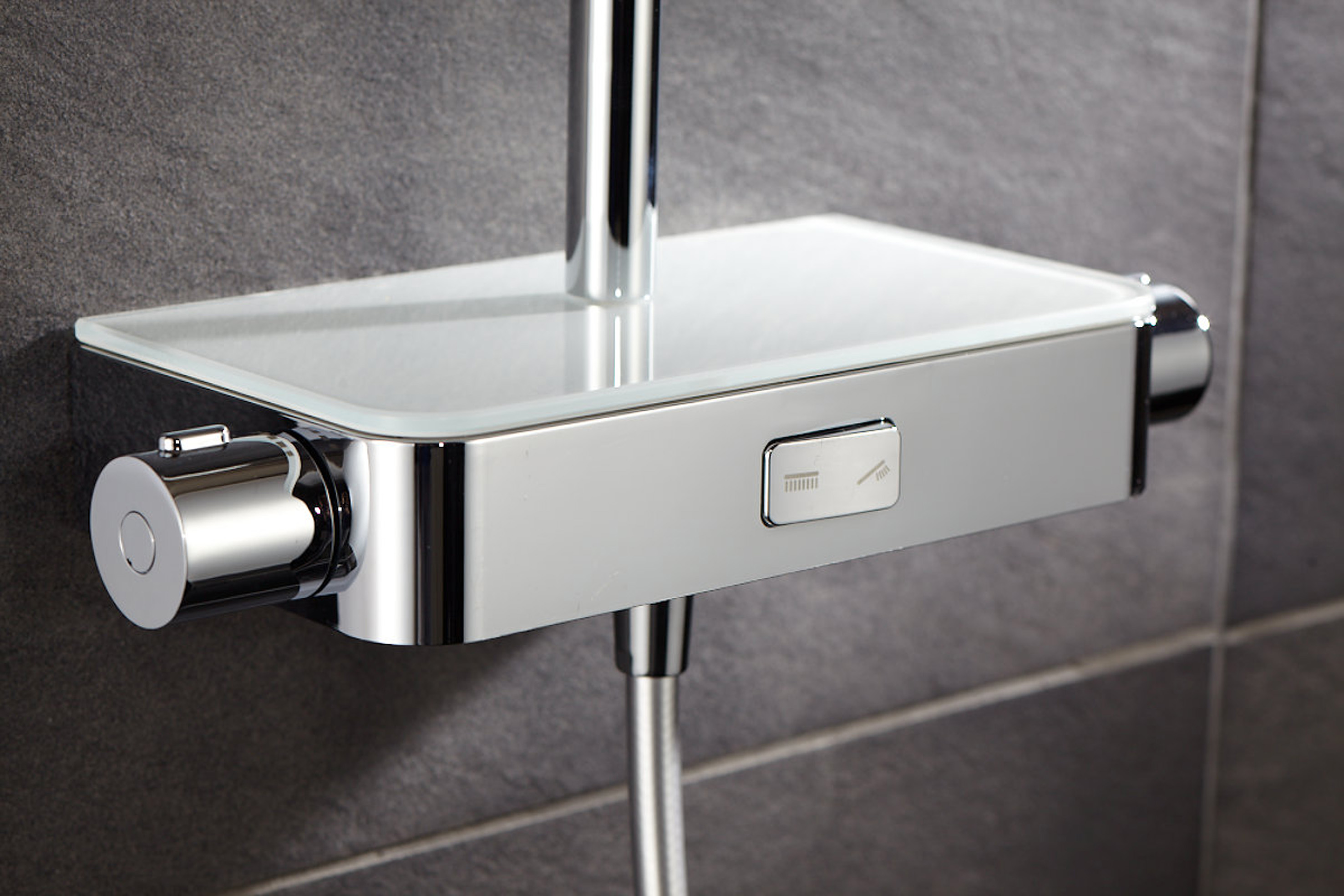Met het armaturen-design AquaTray biedt HSK een elegante en praktische oplossing voor de thuisdouche. De grote douchekop met regen- en stortdouche-instelling wordt gecombineerd met een hoogwaardige handdouche in zacht Softcube-design en met drie verschillende straalsoorten. Dankzij het royale planchet van helder wit glas biedt het armatuur veel ruimte voor alle soorten douchebenodigdheden.