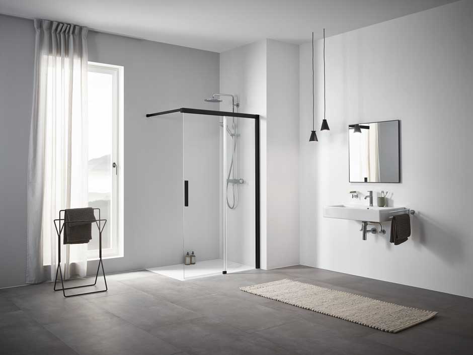 Als gedeeltelijk Walk-In douche-opstelling is NICA aan één kant open en biedt de grootst mogelijke instapvrijheid. Met zwarte profielen wordt de schuifdeur een opvallende blikvanger in de badkamer.
