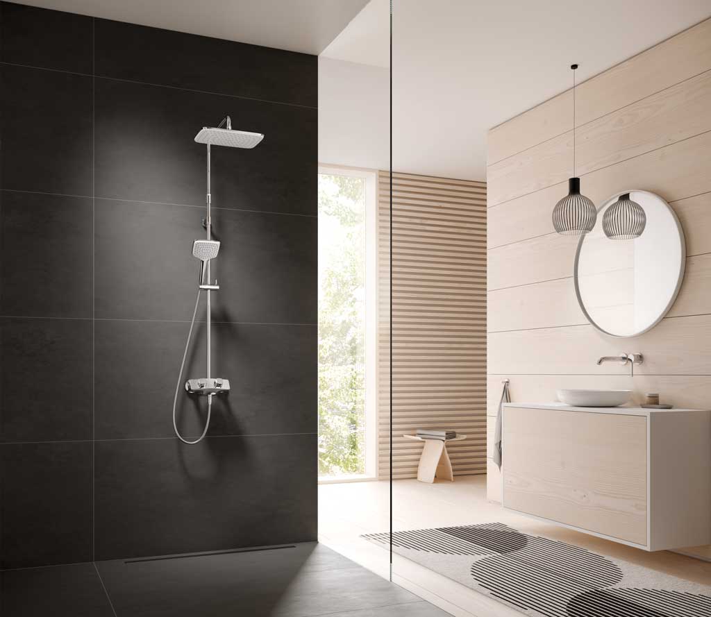 Bovendien biedt het nieuwe douchesysteem een aantal extra functies voor individueel douchecomfort in optima forma. Zo is de 300 mm brede hoofddouche vormgegeven naar de contouren van het menselijk lichaam. De hoofddouche is naar wens te draaien, maar ook -net als de grote handdouche- in hoogte verstelbaar. Zo is het douchecomfort aan te passen aan individuele voorkeuren. Temeer omdat een geïntegreerd kogelgewricht ook een aanpassing van de straalrichting van de hoofddouche mogelijk maakt.