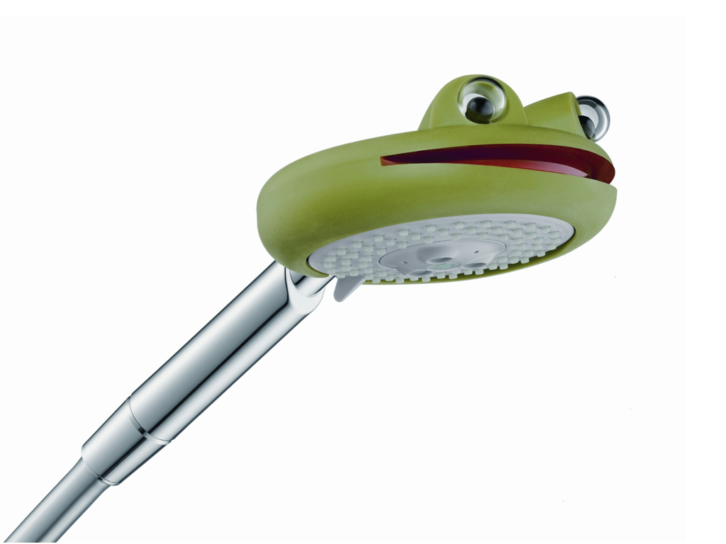 Speciaal voor jonge douchegenieters biedt Hansgrohe nog meer doucheplezier met de Raindance S Froggy handdouche. Deze Raindance S 100 AIR 3jet handdouche is voorzien van een (afneembaar) siliconen kikkergezicht met kraalogen.