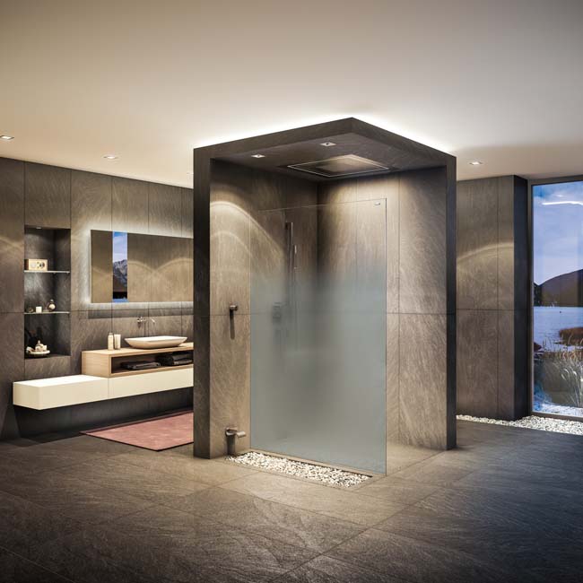 De vrijstaande inloopdouche Air wordt door middel van vloer- en wandprofielen gefixeerd. Om die reden is er geen stabilisatietraverse en ook geen plafondsteun nodig. Voor de montage is er keuze voor opbouw- of inbouwprofielen, beide nagenoeg onzichtbaar. Glashoogte tot 2200 mm, speciale maten en verschillende glassoorten laten ruimte voor individualiteit. Modern, helder en edel.