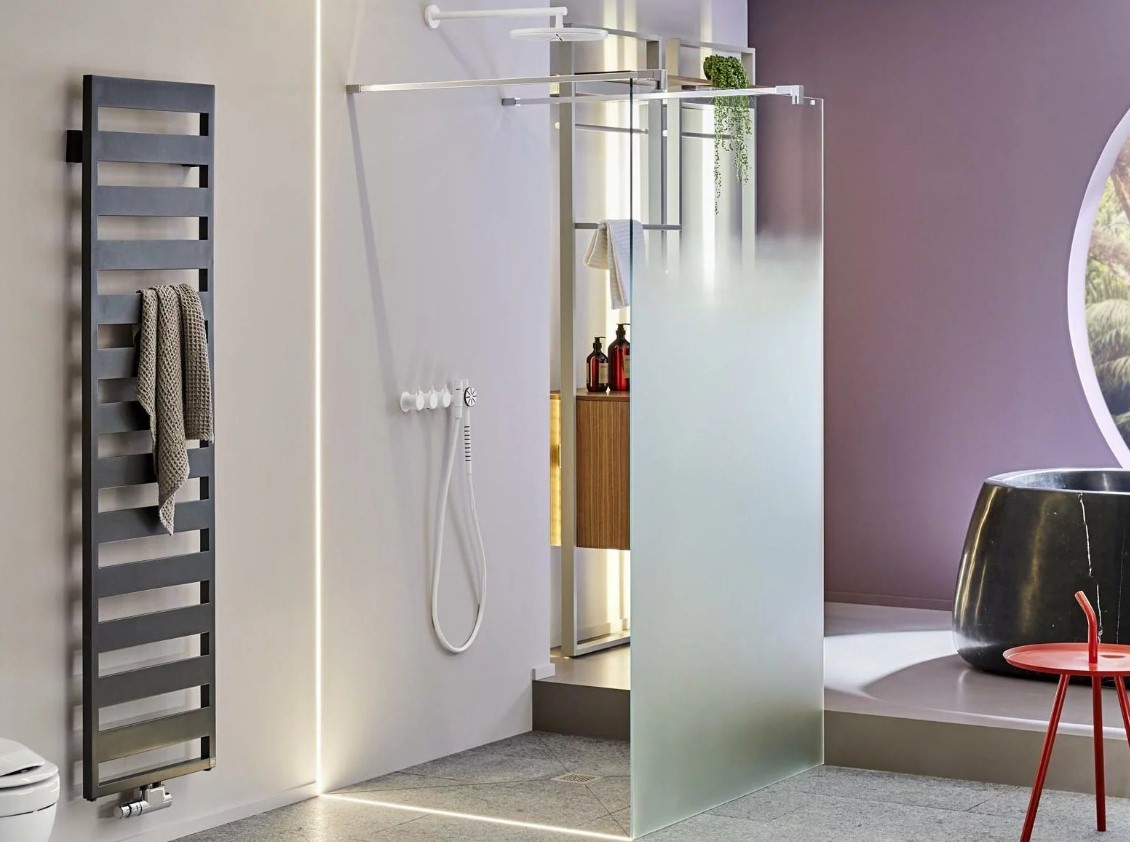Alles uit één stuk van Kermi: de TUSCA varianten douchedeuren, WC-deur met decor en scheidingswand