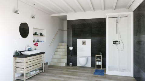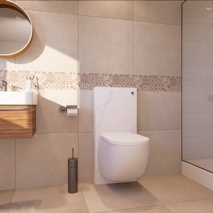 De Sanicompact Comfort Style wordt geleverd met zelfdragend frame, wandcloset met broyeur, soft-close deksel en boxbekleding van aluminium.