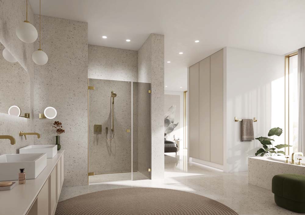 beslag-douchescherm uit de MENA-serie een extra accent. Door de bijzondere textuur krijgt het douchescherm een buitengewone look.