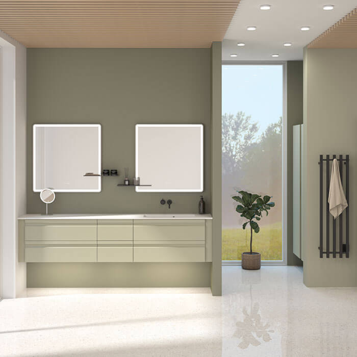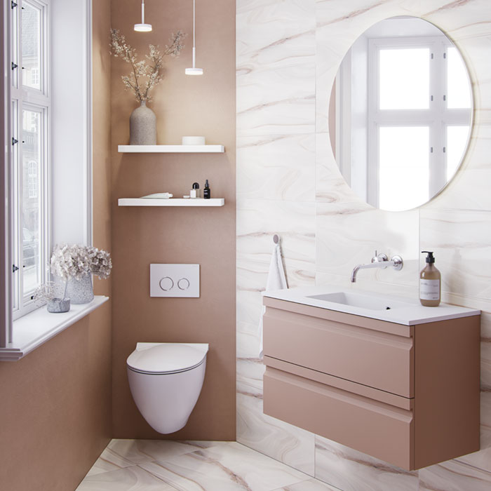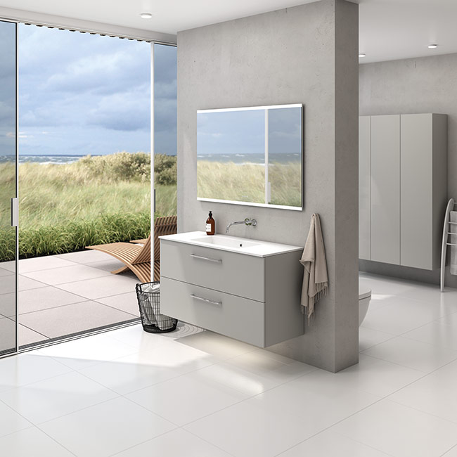 Door zowel de muren als je badkamermeubels in een ton sur ton palet te houden, krijg je een complete, exclusieve en tegelijkertijd rustige uitstraling.