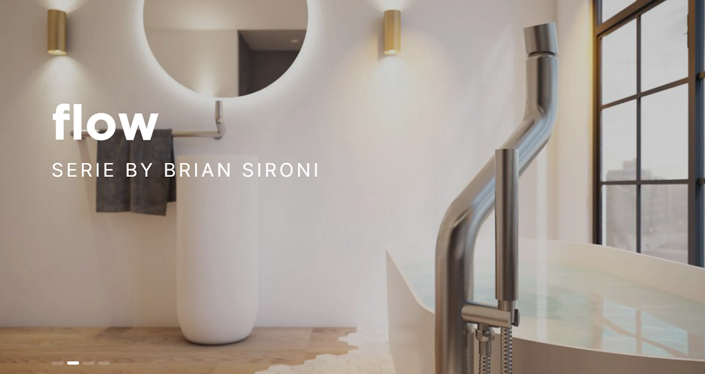 Brian Sironi: “We zien de pijpen zelden; ze zijn verborgen achter muren en onder vloeren. Deze kranen en mengkranen uit de flow-serie onthullen de leidingen en verlengen deze naar de badkamer. ”