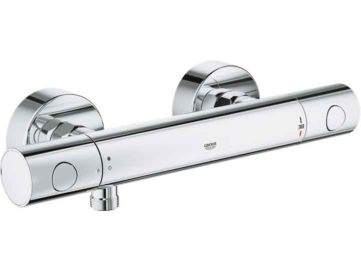 De Grohtherm 1000 Performance is een thermostaatkraan met een nieuw design passend in de badkamers van nu. De slim ontworpen ProGrip van de Grohtherm 1000 Performance geeft precieze controle op waterstroom en temperatuur, zelfs met zeep op je handen. Dankzij de GROHE CoolTouch behuizing wordt het kraanoppervlak niet warm tijdens het douchen. Het hete water in de kraan wordt omspoeld door koud water en een speciale verbinding bij de warmwateringang van de thermostaat zorgt ervoor dat het hete water niet direct in contact komt met het kraanoppervlak. Er is dus geen kans om je daaraan te branden.