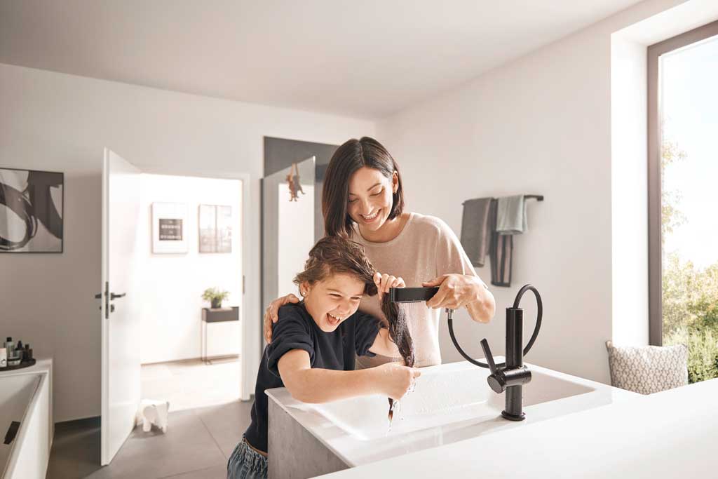 Finoris van hansgrohe is een minimalistische kranenserie met onder andere een kraan met uittrekbare vuistdouche en twee straalsoorten, die alle badkamerrroutines voor het hele gezin stijlvoller, flexibeler en comfortabeler maakt. Ideaal voor het wassen van kleren, haren of om de baby een badje te geven. Het gereduceerde, geometrische silhouet past perfect in een minimalistisch interieur. Naast chroom zorgen kleuren als mat zwart en mat wit voor een persoonlijke touch. De ComfortZone technologie zorgt voor meer vrije ruimte, bedieningsgemak en minder opspattend water.