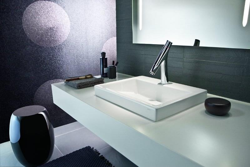 Bewust gebruik van water: aparte bediening van volume en temperatuur voor meer comfort en een lager waterverbruik. De wastafelmengkranen in de nieuwe collectie maken het mogelijk om water en energie op een intuïtieve, ergonomische en economische manier te gebruiken. Het volume en de temperatuur zijn apart te bedienen. De Axor Starck Organic wastafelmengkraan wordt open en dicht gedraaid aan de onderkant van de uitloop. Het volume wordt ook middels deze greep bediend. Dit is heel ergonomisch, omdat de handen daar zijn waar het water uit de kraan komt. De temperatuur wordt boven aan de kraan geregeld. Als deze standaard op de energiebesparende koud water stand wordt gezet, wordt automatisch energie bespaard.
