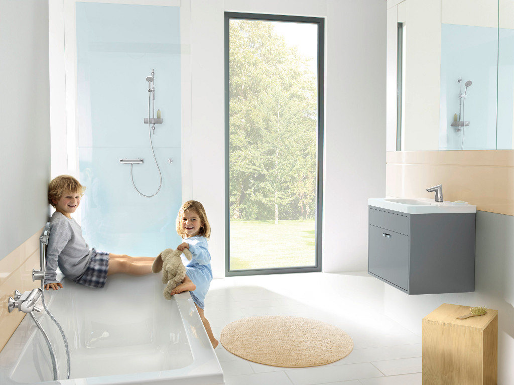 De HANSAFIT glijstangset is beschikbaar in twee varianten: met of zonder stevige handgreep. De sets worden gecompleteerd met een HANSAFIT douche- of badthermostaat. De geïntegreerde heetwaterblokkering bij 38°C beschermt tegen verbranden. Ook het kraanhuis zelf blijf veilig koel, dankzij de THERMO COOL functie. De met een gekleurde rand afgezette bedieningselementen, voorzien van Soft Touch-oppervlak, staan borg voor een goede en veilige grip op de kraan. De nieuwe handdouche met drie verschillende straalsoorten en antikalk-noppen draagt, is voorzien van een geoptimaliseerde waterdoorstroom, voor comfortabel en tegelijkertijd water- en energiebesparend douchen.