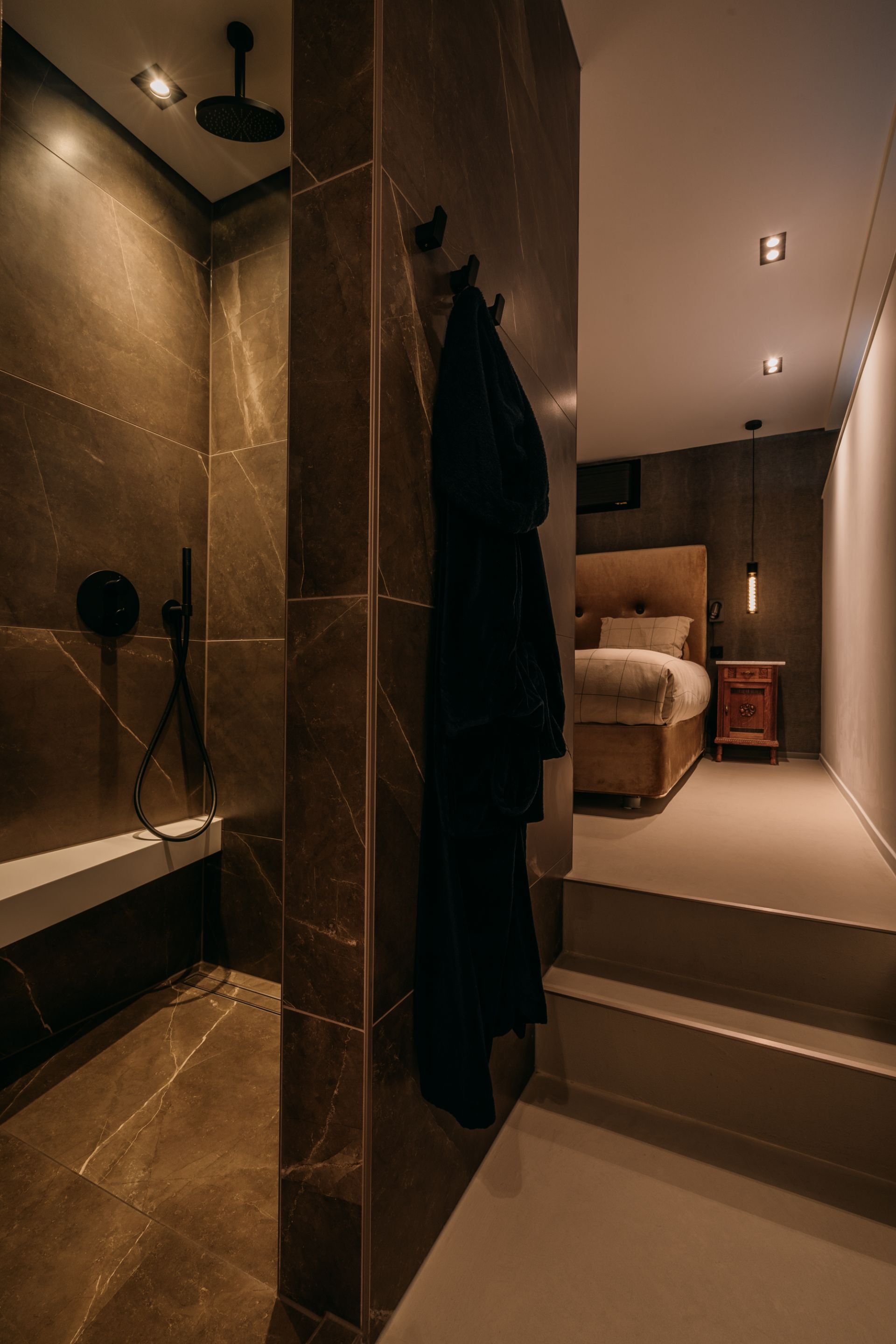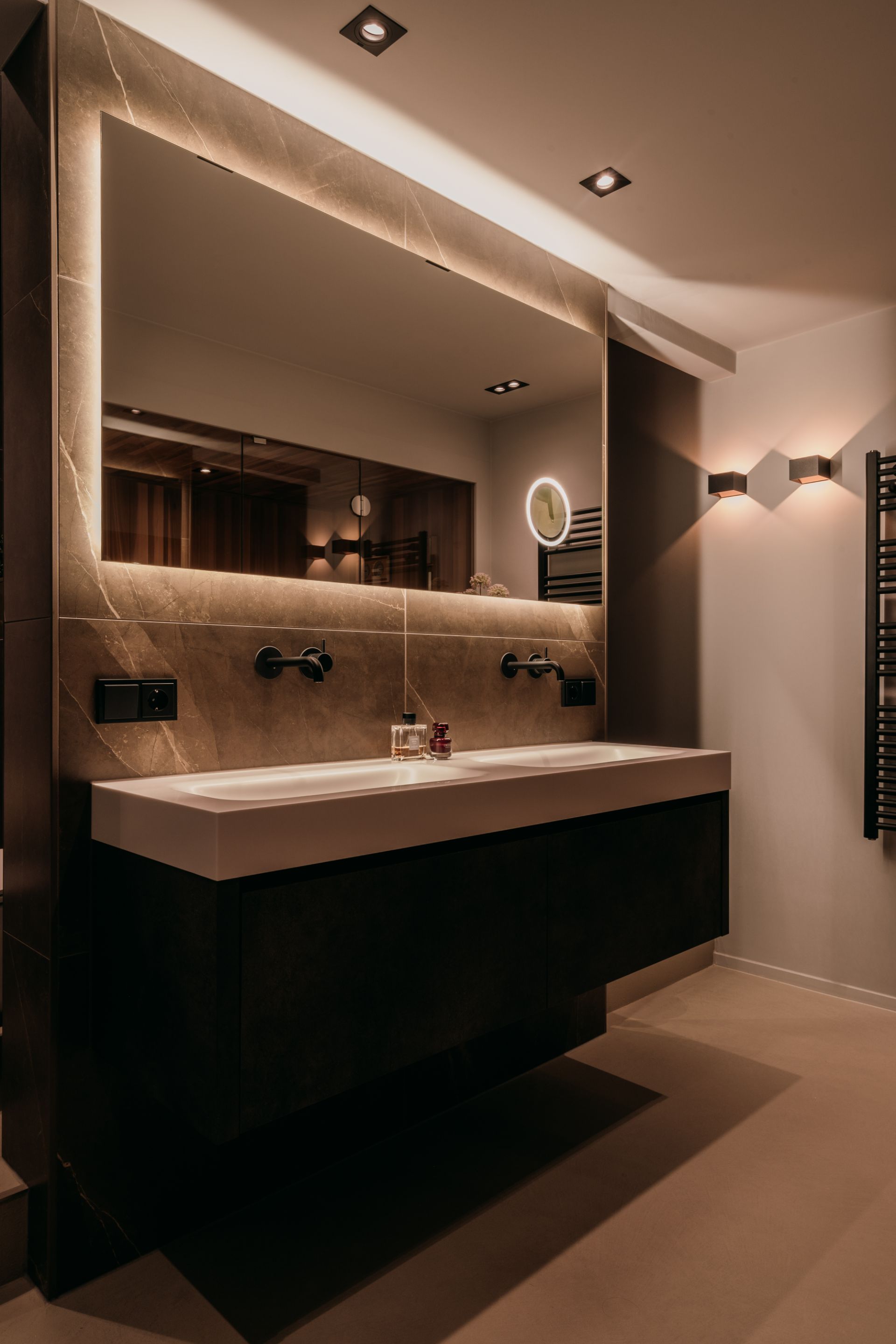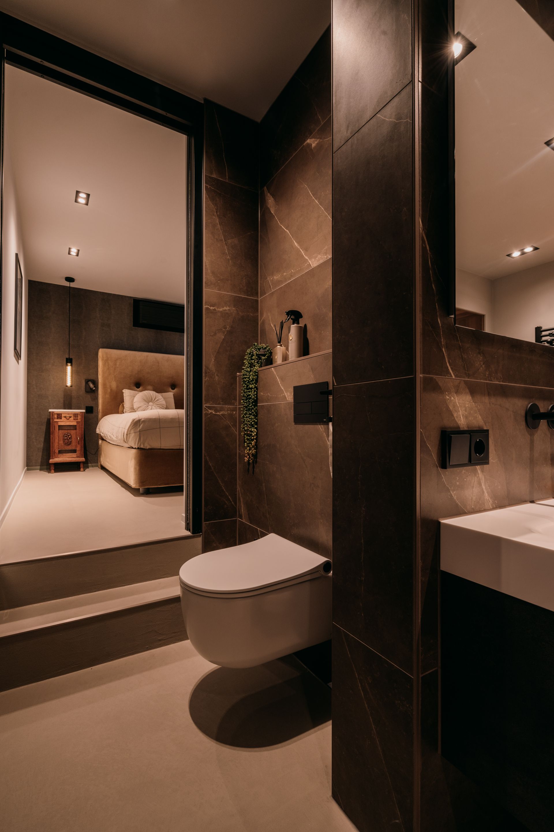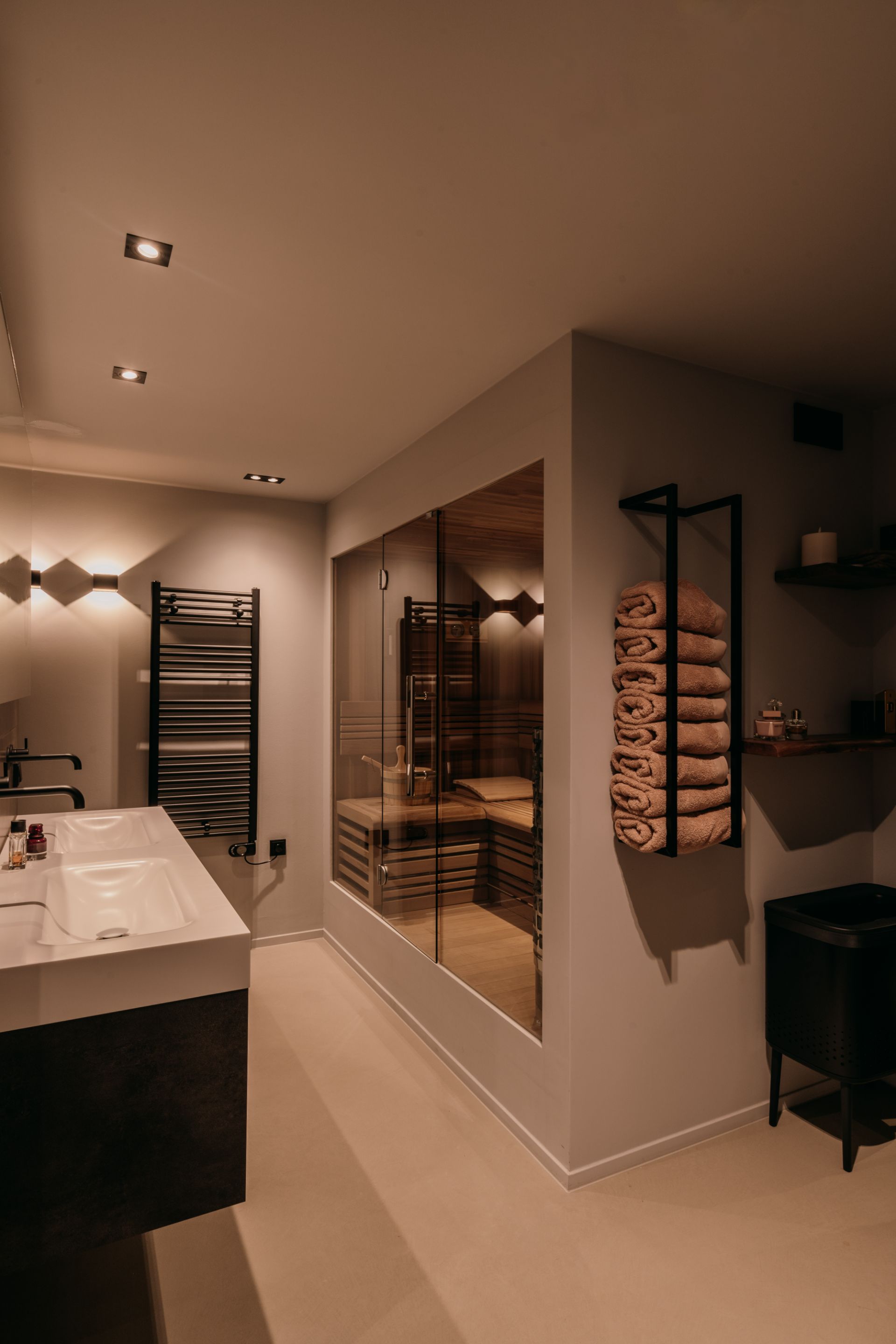 Deze luxe badkamer is een oase van rust en comfort, met tegels op de muur die een harmonieuze sfeer creëren. De vloer en het licht zijn licht van kleur, waardoor de ruimte groter en frisser lijkt. Hier kun je je helemaal relax voelen in een hotel chique stijl. De badkamer is een plek waar je je kunt verwennen met luxe en comfort. Een luxe badkamer slaapkamer en sauna en toilet in een is een van de meest gewilde woonwensen. Dit is een perfecte manier om comfort, privacy en ontspanning te ervaren in je eigen huis. Dit is een perfecte plek om te ontspannen en te genieten.
