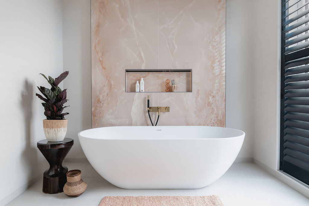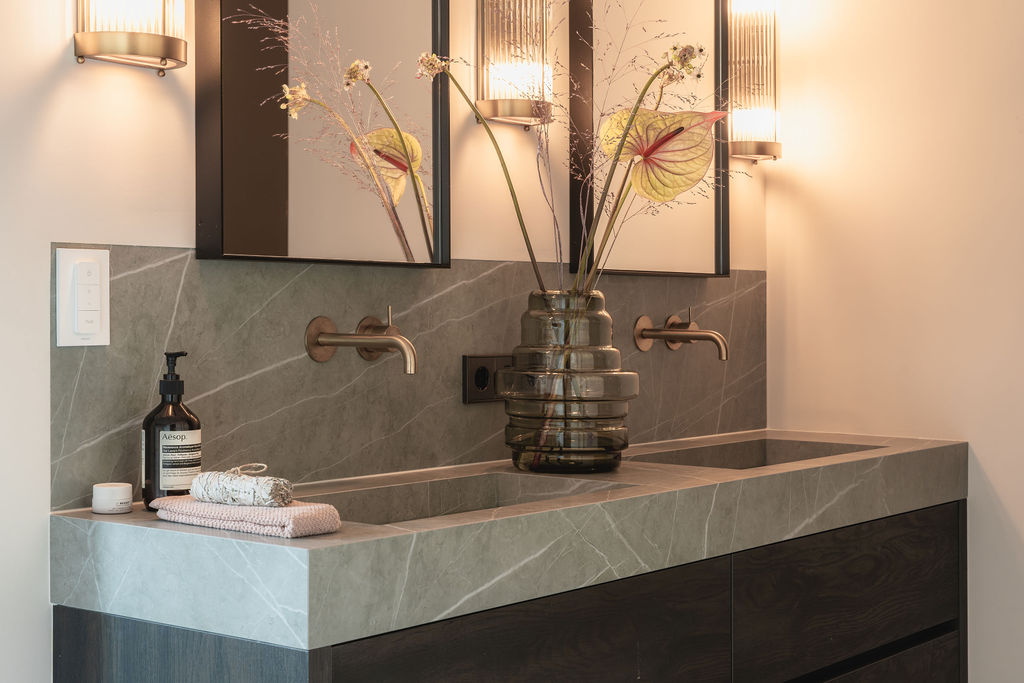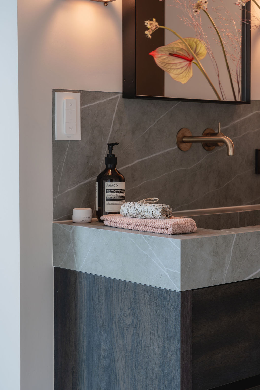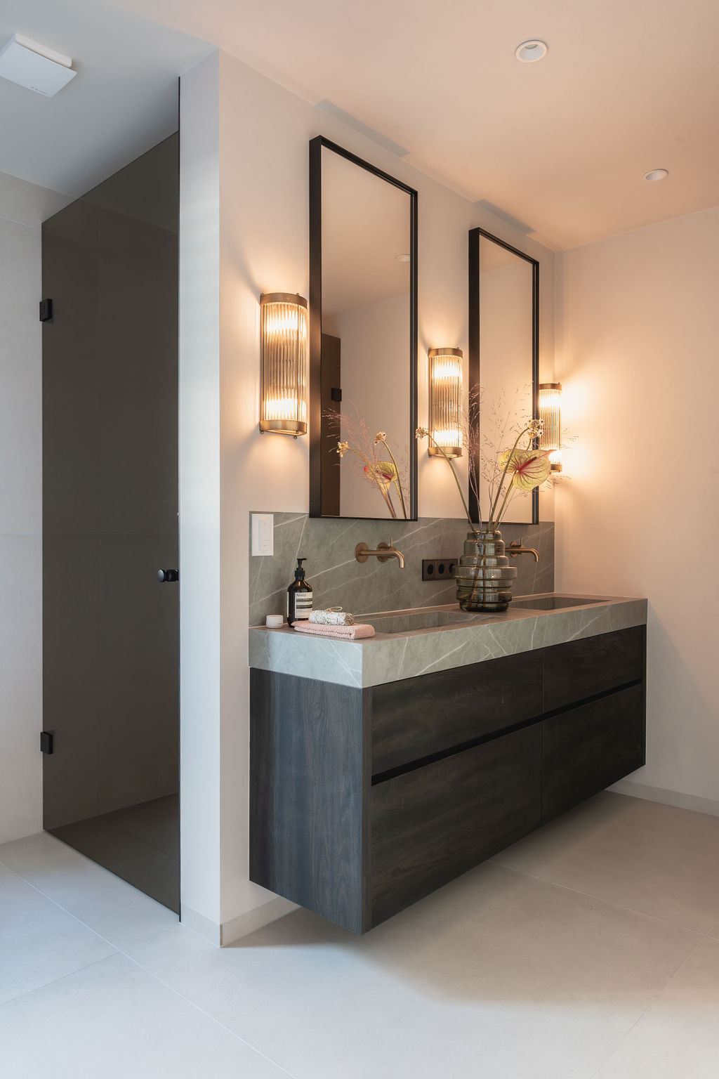 Achter het vrijstaande bad is een statement gemaakt met een prachtige marmerlook slab tegel. De zachtroze kleur geeft de badkamer warmte. De inloopdouche met twee regendouches en het wastafelmeubel zijn ook juweeltjes. Details, zoals de verlichting welke geplaatst is naast de spiegels, versterken het gevoel van luxe.