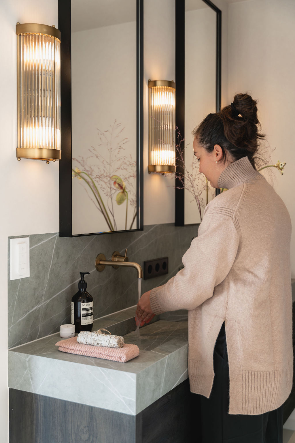 “We komen van een appartement en deze badkamer is gerealiseerd in onze nieuwbouwwoning. Ik heb binnenhuisarchitectuur gedaan en daar vanuit daar ben ik gaan kijken naar leveranciers die pasten bij ons huis, onze stijl en ons project. En zo kwam De Eerste Kamer naar boven.”
