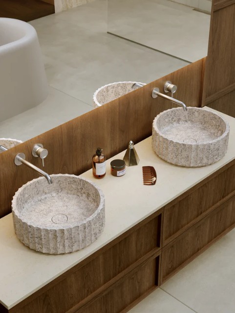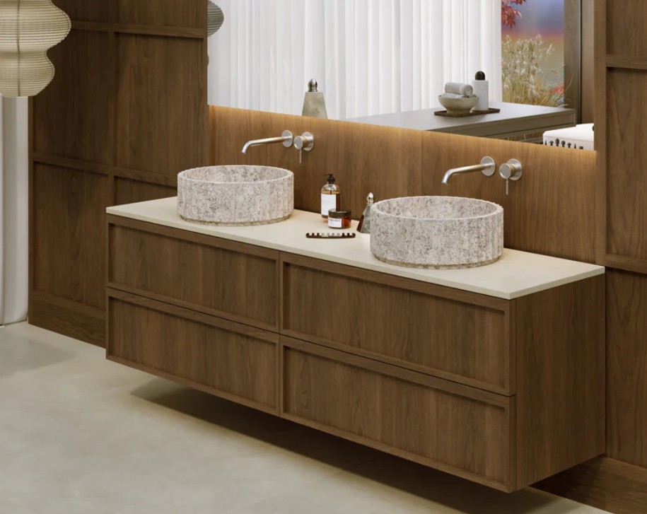 Met de introductie van Neo Japandi geeft Mastello een eigentijdse interpretatie aan deze ontwikkeling. De collectie, die op 17 maart 2026 wordt gelanceerd, bestaat uit het houten Sumi meubel en de natuurstenen waskomlijn The Marbles.