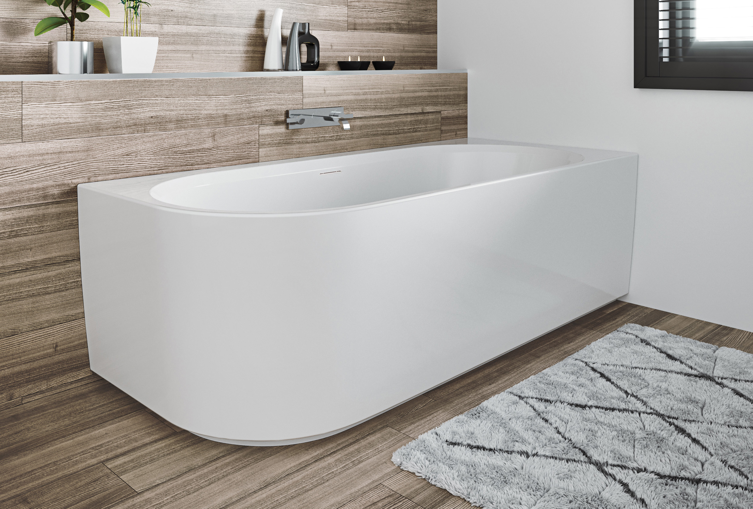 Het half vrijstaande hoekbad Desire van RIIHO is nu ook beschikbaar in een compactere afmeting van 170 x 77 cm.