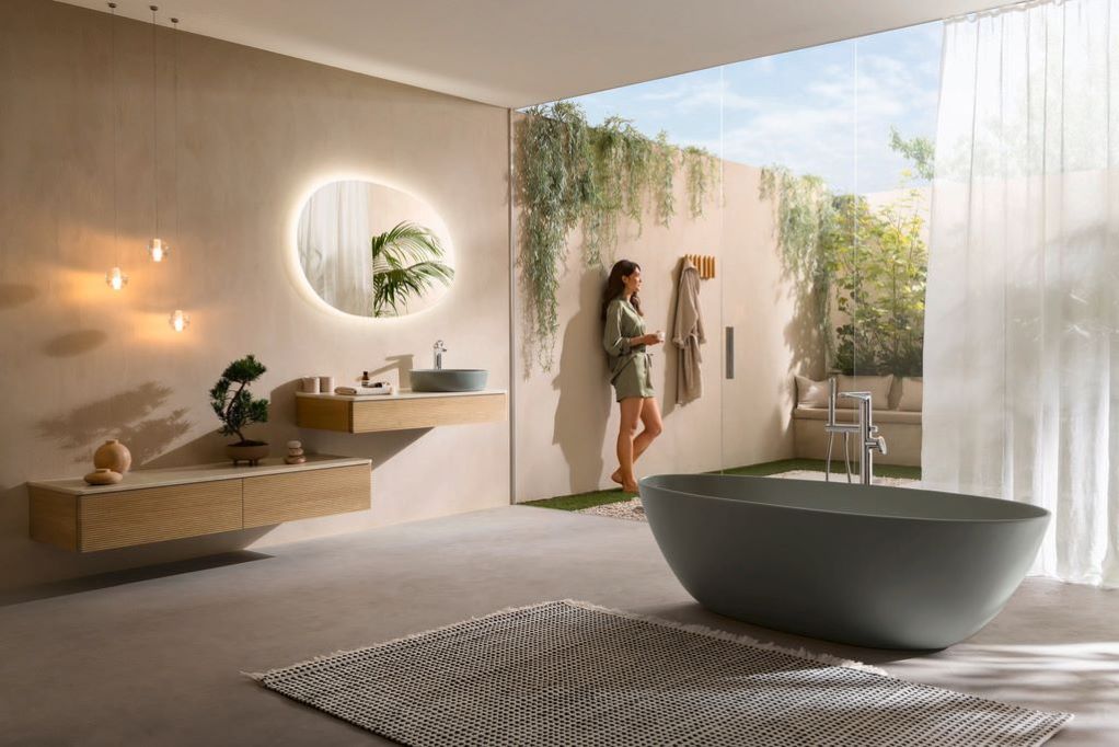 De ronde vormen zien we ook terug in de badkamermeubels. Van wastafelmeubels tot hoge kasten van massief hout, lak en zelfs van natuursteen. De verschillende onderdelen zijn naar wens in te delen. Mix en match de nieuwste kleuren Stone Grey, Leaf Green, Midnight Blue met Honey Oak of Warm Walnut voor spannende combinaties of ga voor één kleur in verschillende materialen voor een ton-sur-ton look. De bijpassende spiegels in organische vormen zijn een mooie aanvulling en maken de natuurlijke sfeer compleet. Verkrijgbaar in drie uitvoeringen mét verlichting.