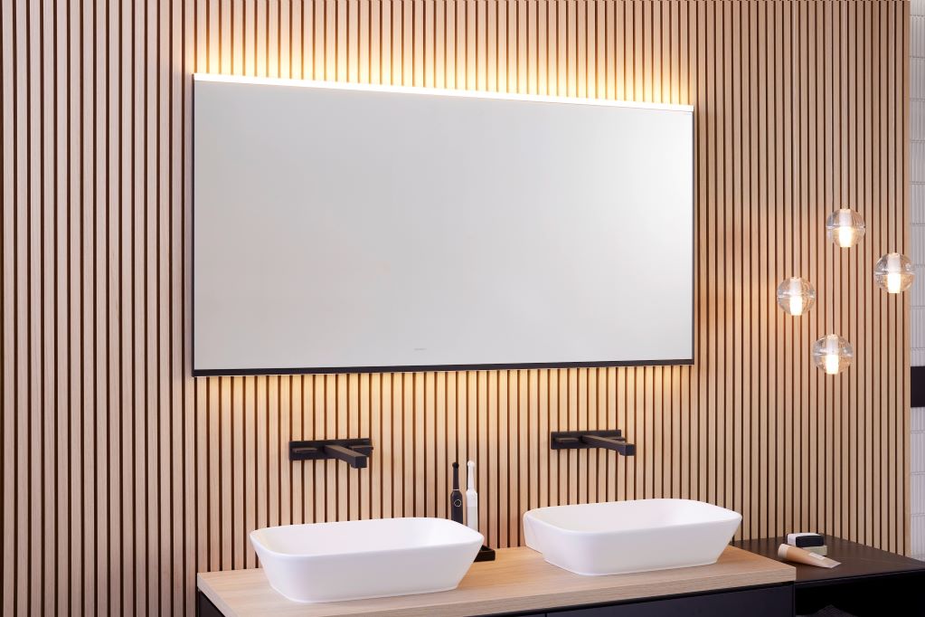 De premium spiegellijn Geberit Option Plus Square voldoet aan de hoogste comforteisen. De spiegels bieden optimale lichtomstandigheden in de badkamer, een verblindingsvrije verlichting van het spiegelbeeld en vele extra functies, die zorgen voor meer welzijn in de badkamer. De vierkante Geberit Option Plus-modellen, met een hoogte van 70 cm, zijn naast de bestaande maten (40, 60, 75, 90 en 120 cm) nu ook verkrijgbaar in uitvoeringen van 105, 135 en 160 cm breed. Naast een aluminium lijst is nu ook een trendy mat zwarte lijst toegevoegd aan het Plus-assortiment. Hiermee PERSBERICHT worden de ontwerpmogelijkheden van de Option Plus Square verder uitgebreid en kan de spiegel moeiteloos gecombineerd worden met andere zwarte accenten in de badkamer.
