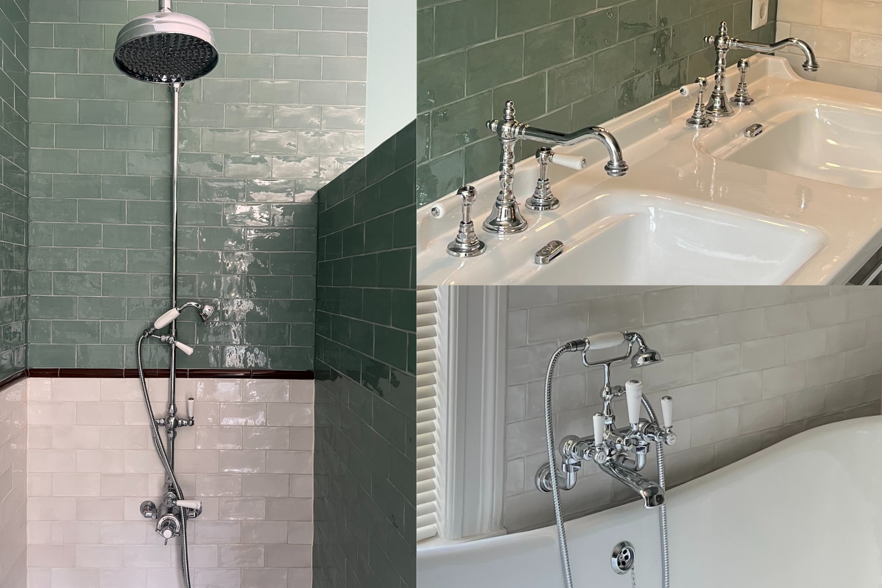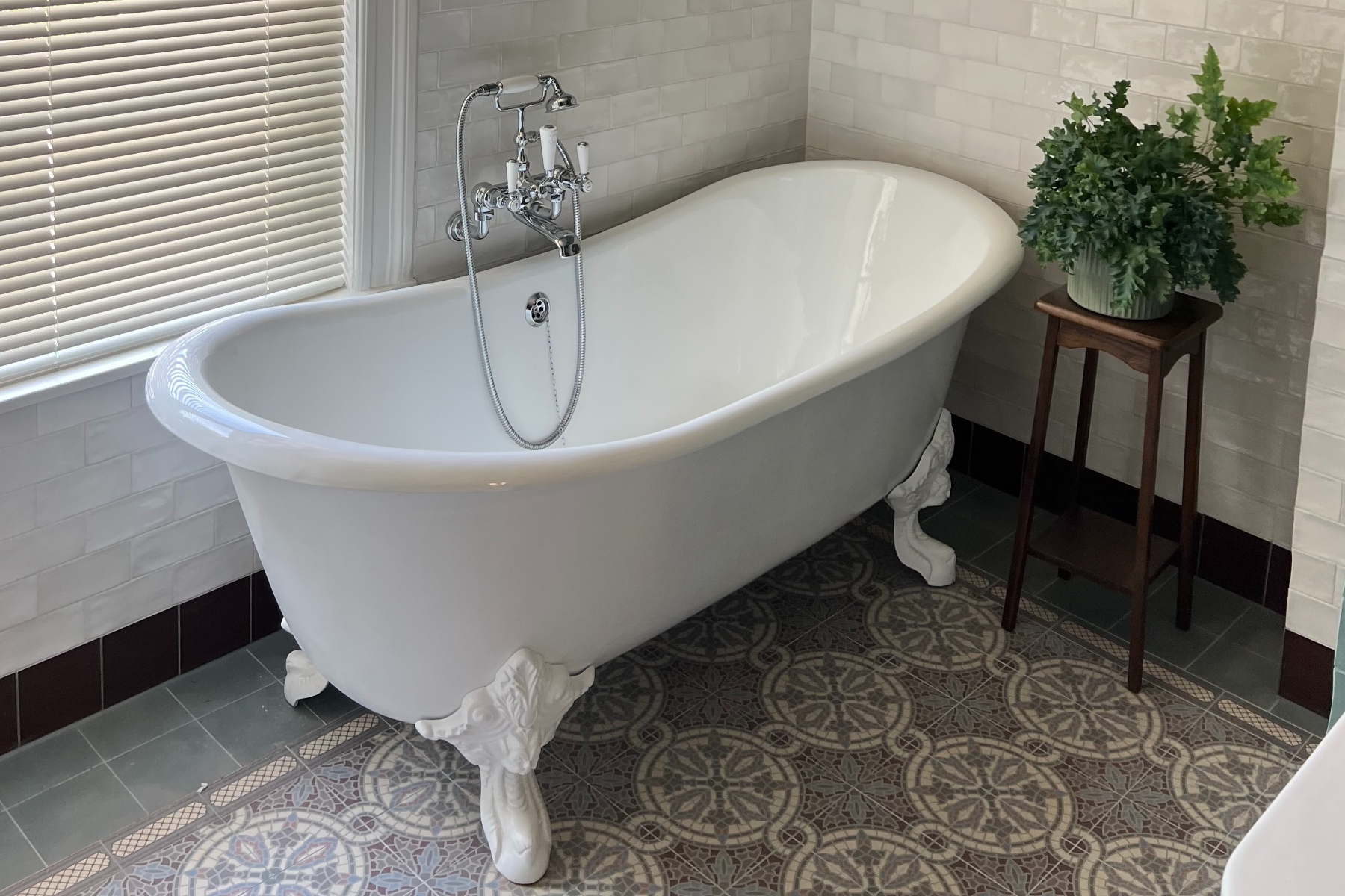 Voor een klant mocht Windsor Bathrooms & Kitchens een klassiek bad op pootjes, dubbele wastafel Portofino met de Seine wastafelkranen HS1022FR in chroom, sfeervolle wandlampen Charrington, badkraan voor aan de muur en een thermostatische douchekraan met witte hendels leveren. De mooie tegels maken deze klassieke badkamer helemaal af tot een prachtig geheel.