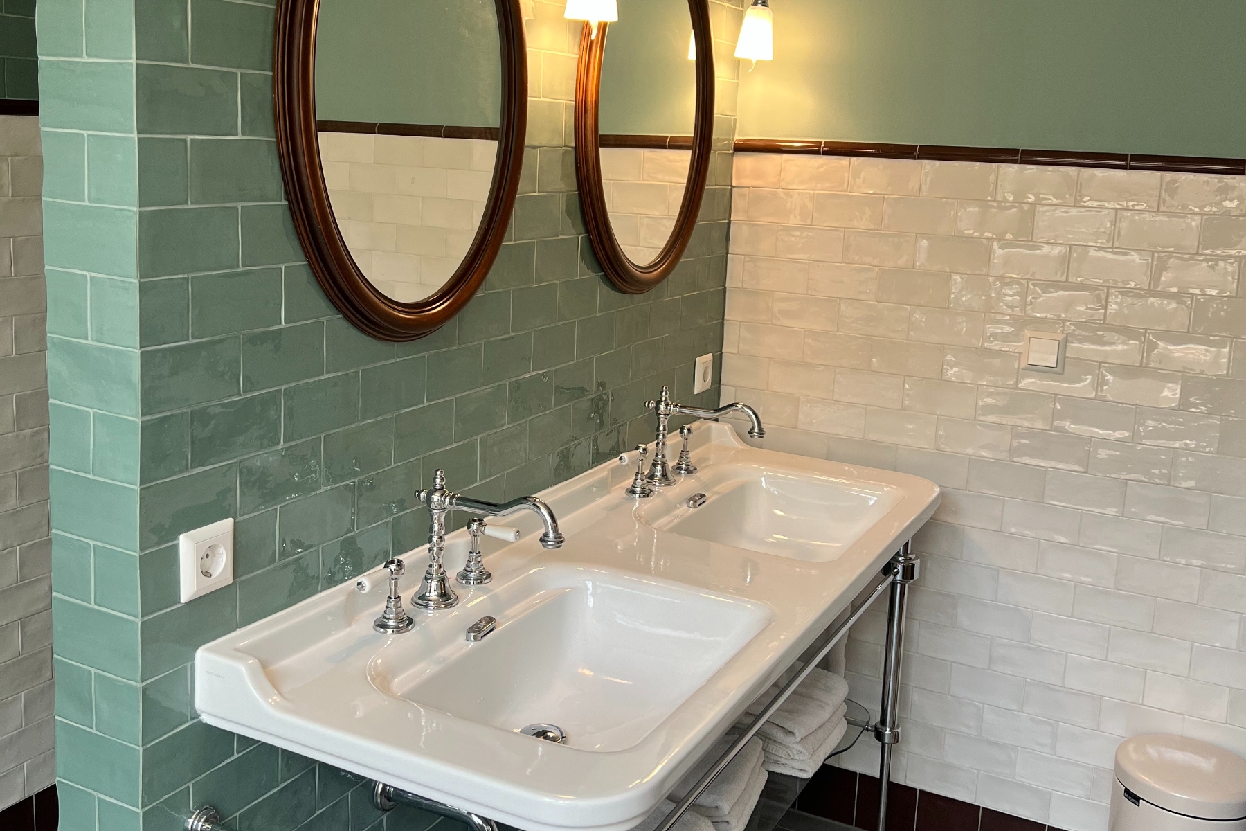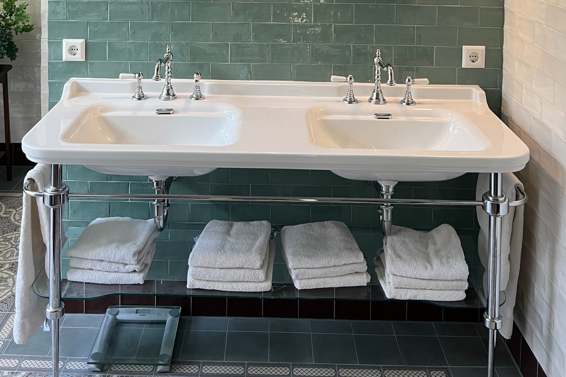 Complete badkamer met bad op pootjes, dubbele wastafel met kranen en sfeervolle wandverlichting