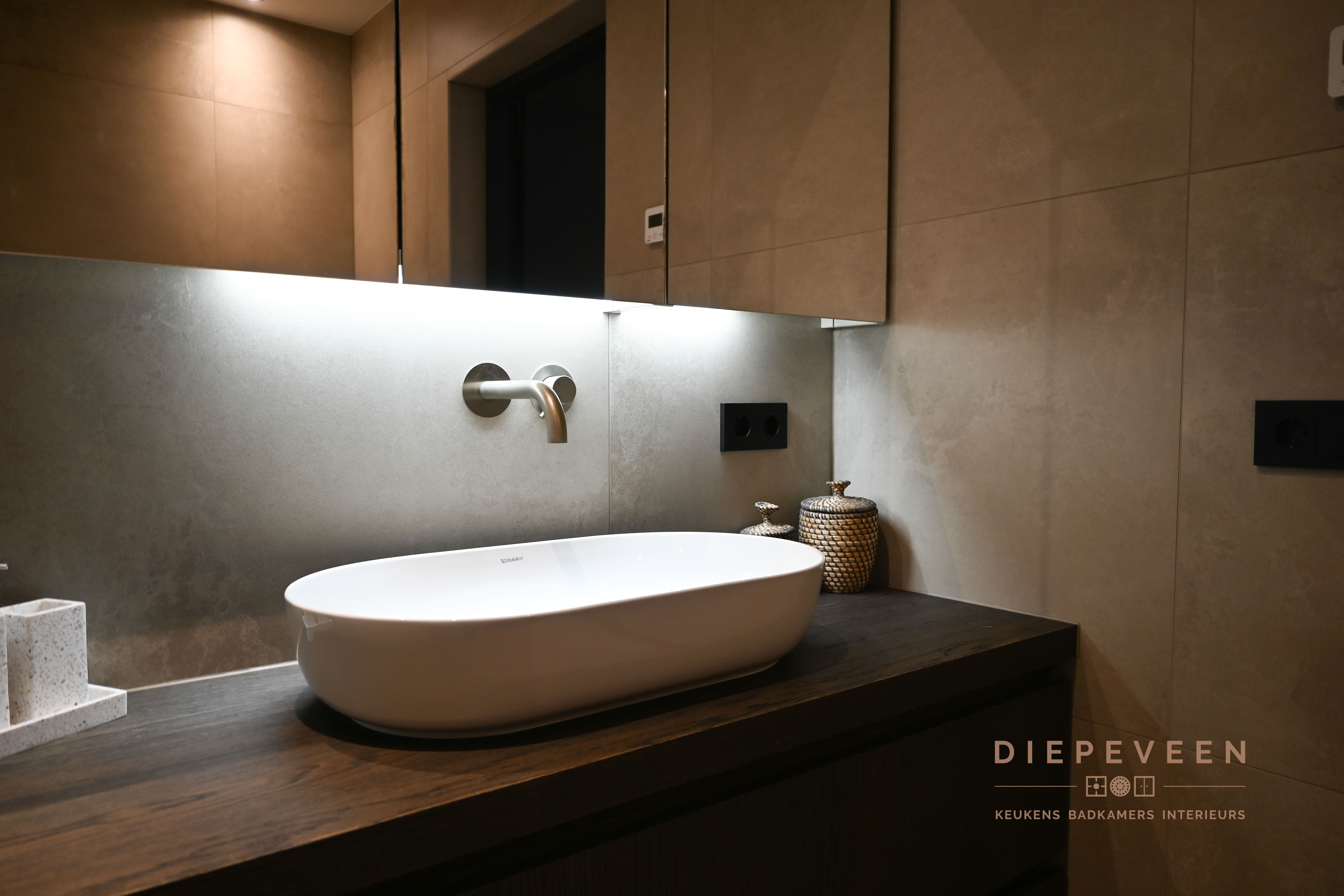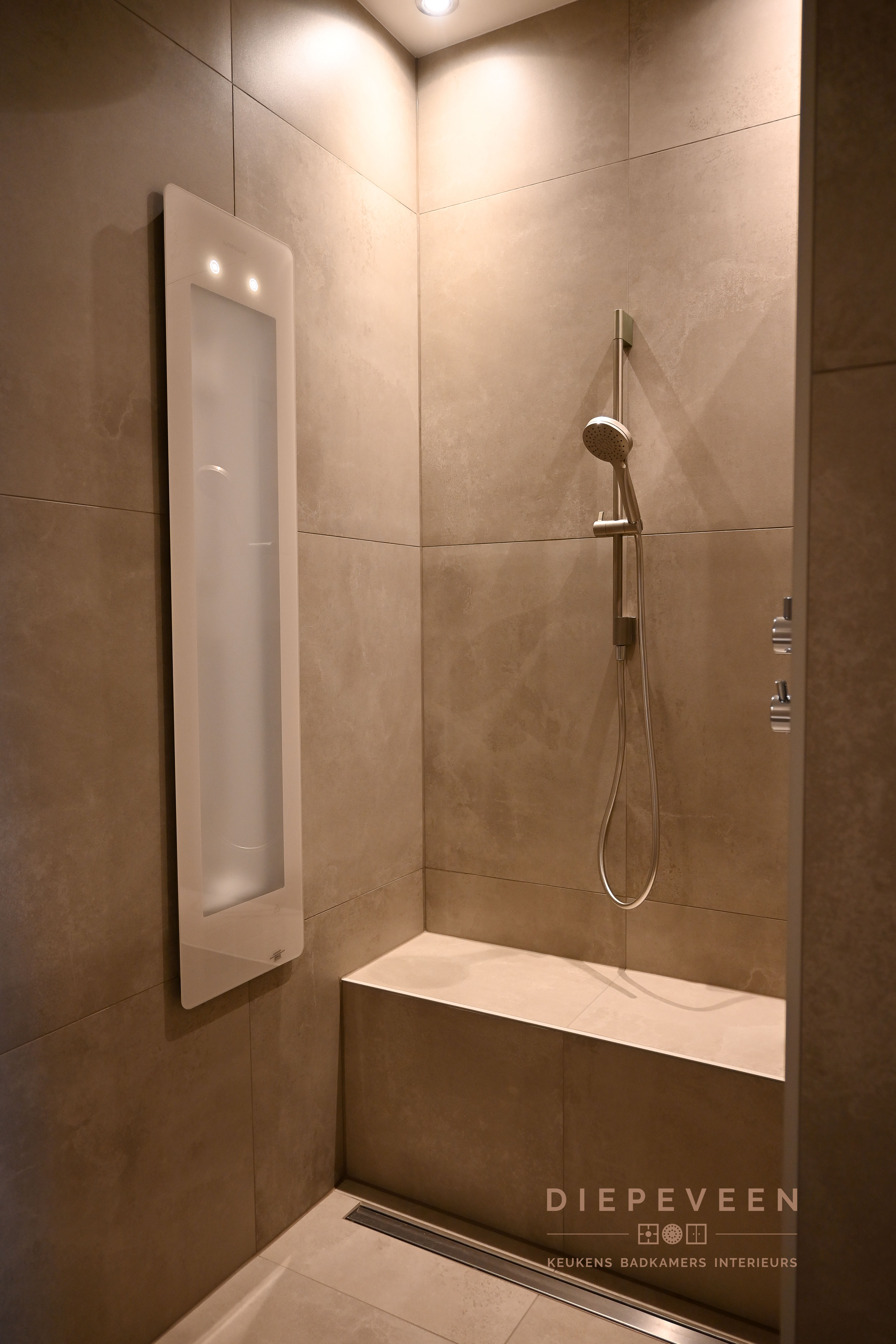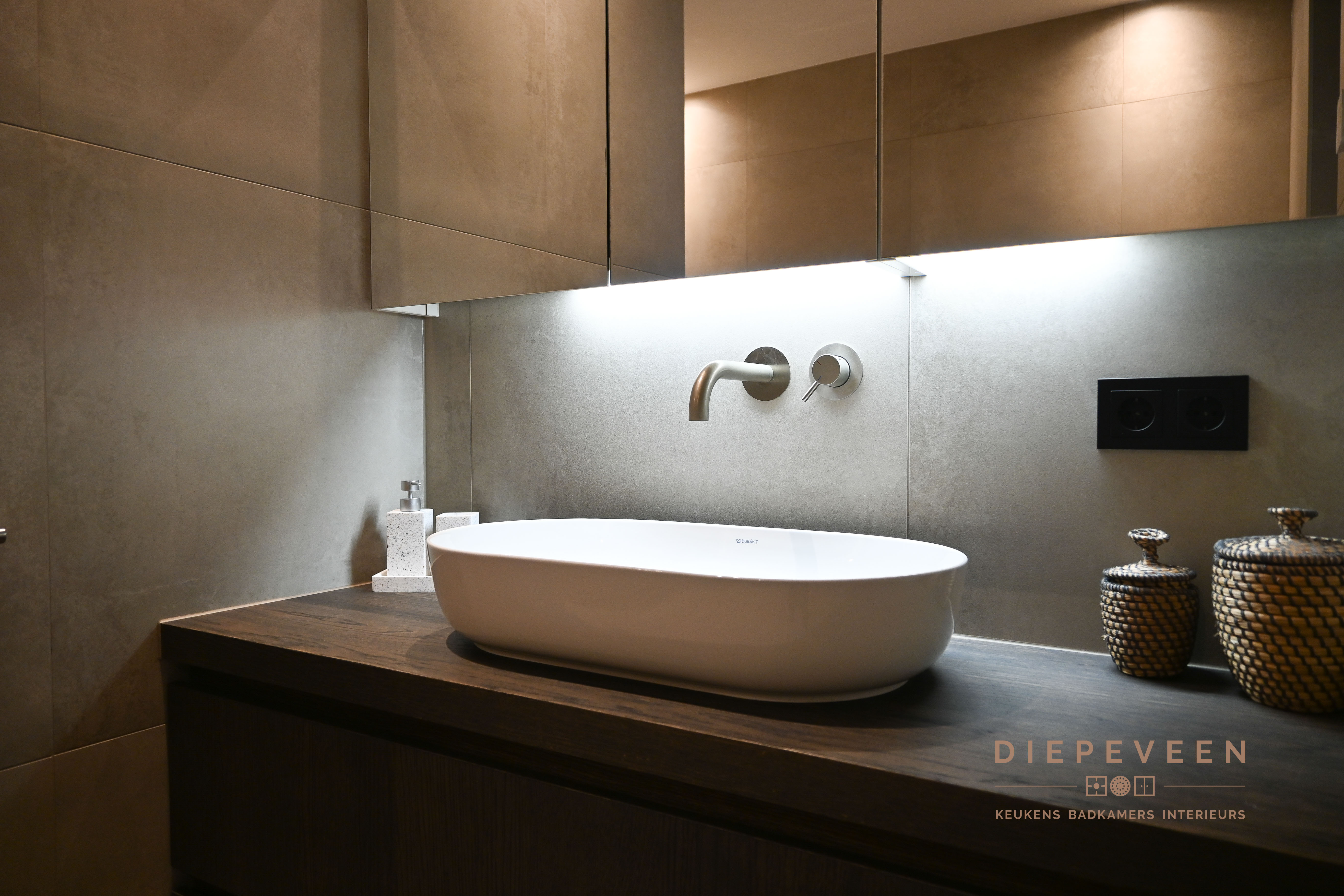 || RUIME BADKAMER & TOILET || Deze ruime badkamer biedt de perfecte balans tussen luxe en comfort. De lichtgrijze tegels en het ingebouwde bad creëren een rustige, sfeervolle uitstraling. De douche, met zitplek en Sunshower, voegt een extra element van ontspanning toe. Het wasmeubel in een donkere kleur hout met brede wasbak, gecombineerd met kastjes met spiegels en verlichting, zorgt voor een moderne en warme touch. Boven het toilet zorgt het zwarte element voor een stijlvol contrast, wat de ruimte extra karakter geeft. In het aparte toilet komen de grijze tegels en donkere houtaccenten mooi terug, terwijl de zwart-marmeren muur achter de wc de ruimte een luxe uitstraling geeft.