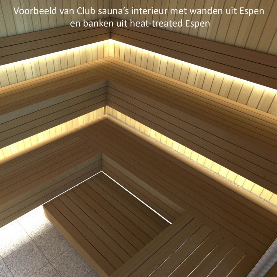 De Dutchwaters sauna Club Alder HT-Espen is een exclusieve en ruime sauna die ook makkelijk te installeren is tussen bebouwde muren. Schitterende roosters uit Heat Treated Alder aan de buitenzijde van de sauna zorgen voor een exclusieve uitstraling aan de buitenkant en een zacht licht aan de binnenkant van de sauna. De discrete LED lichten onderaan de rugleuningen zorgen ook voor de zachtheid van het licht en de schoonheid van de sauna. De schoten uit Espen aan de binnenzijde samen met de ruime banken uit Heat Treated Alder zorgen voor rust en comfort binnen de sauna. U kunt in de sauna Club zowel liggend als zittend.