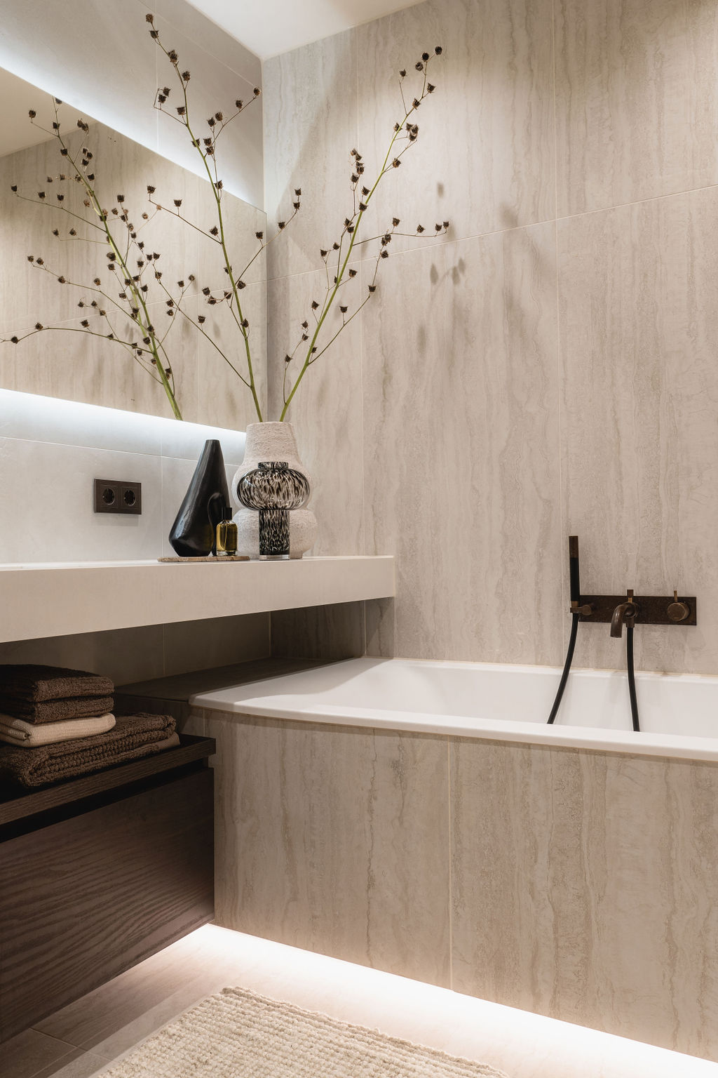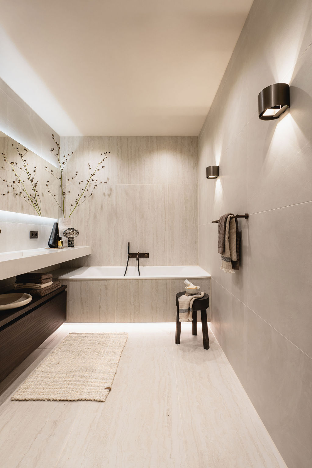 In de relatief smalle ruimte is elke vierkante centimeter zorgvuldig overwogen. De strategische keuze voor grote, horizontaal geplaatste travertin tegels zorgt voor een optische verbreding van de ruimte. Het zwevende bad, dat van onder subtiel verlicht wordt, versterkt het ruimtelijke effect. Tevens geeft het een gevoel van luxe en wellness. Het vakmanschap komt tot uiting in elk detail van de badkamer. Van de nauwkeurig gelegde travertin tegels tot de zorgvuldig geconstrueerde wastafel die elegant over het bad heen loopt. Deze elementen zijn gecombineerd met Hotbath kranen die een fraai accent bieden op de kleur van steen.
